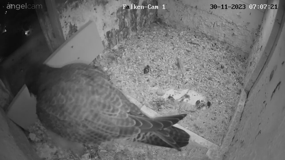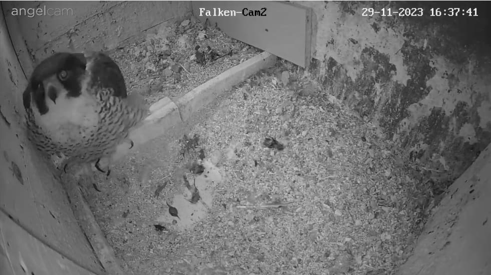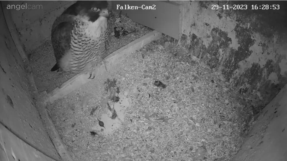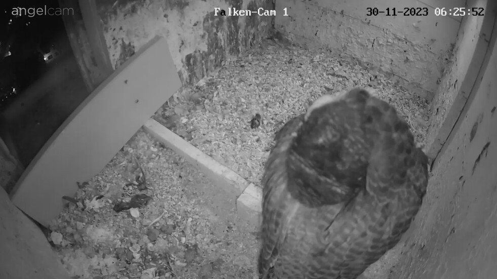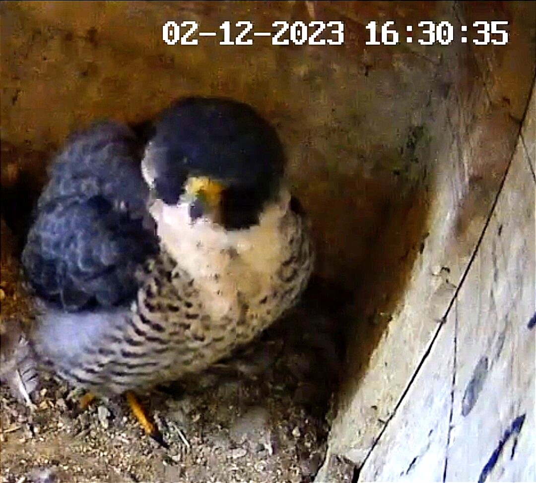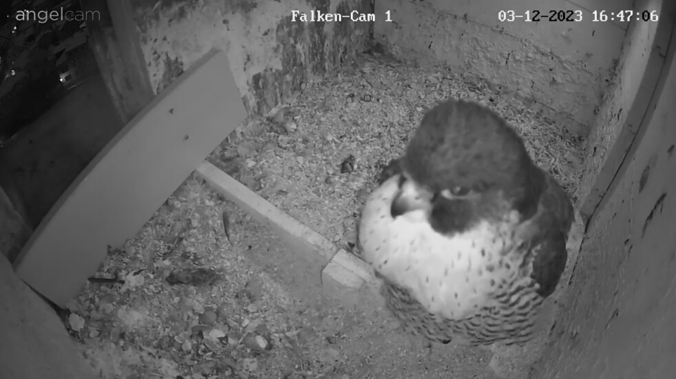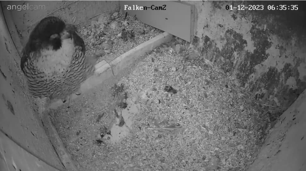 Auch unseren Morizfalken macht das Winterwetter offensichtlich gar nichts aus. Am Samstag vor dem 1. Advent saßen beide trotz Schneefall und eisigem Wind tiefenentspannt auf dem Dach der Kirche: