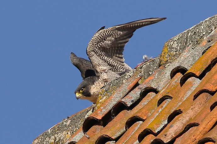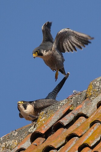 Soweit, sogut - und so verkehrt… Der Falke oben am Balkon schwang sich nämlich plötzlich in die Lüfte, flog eine rasante 180 Grad-Kurve und stieß auf den auf dem Dach sitzenden Falken herunter.