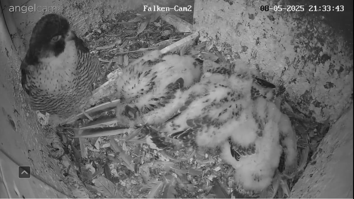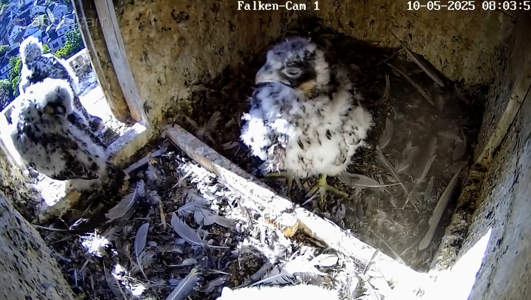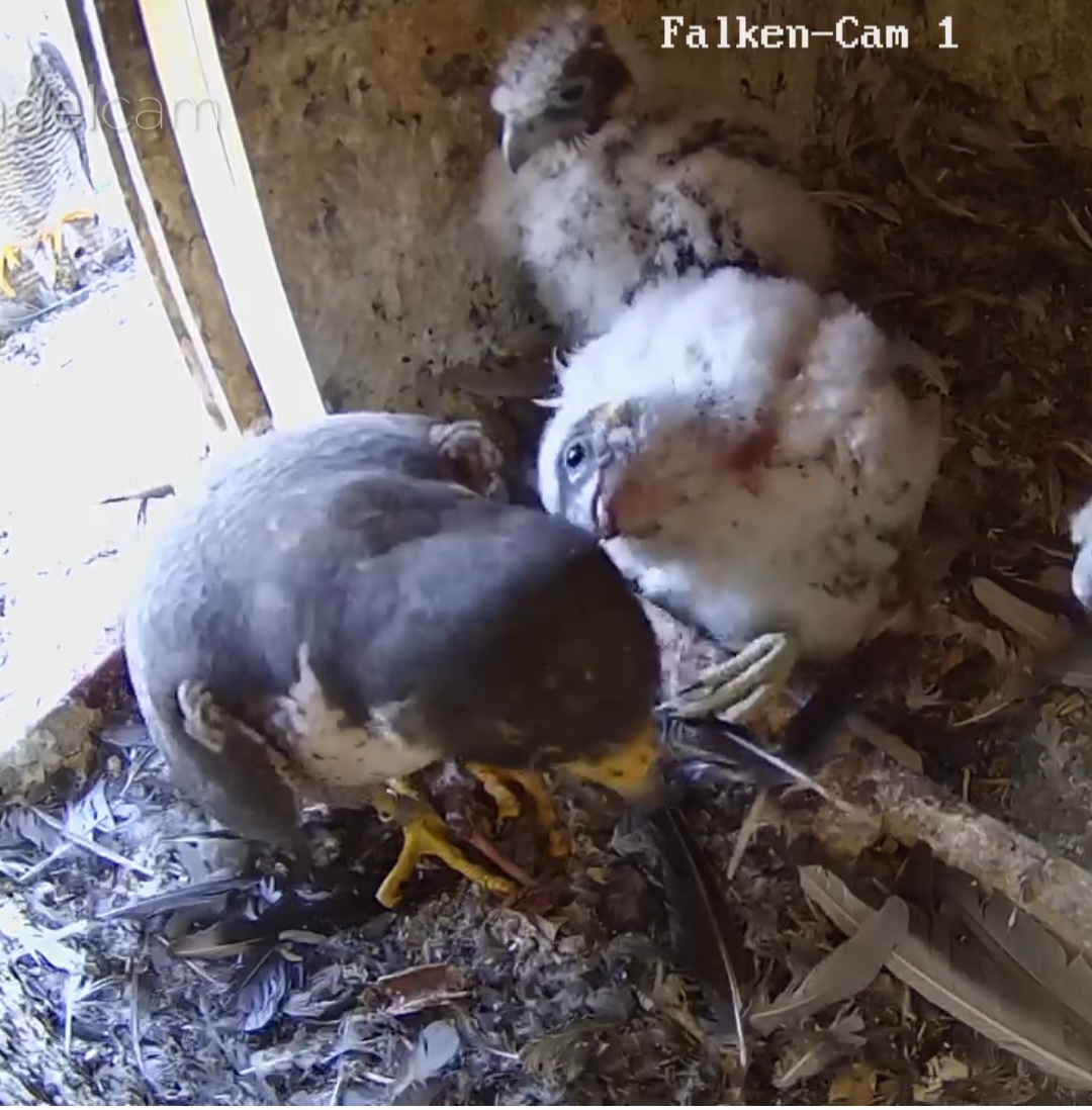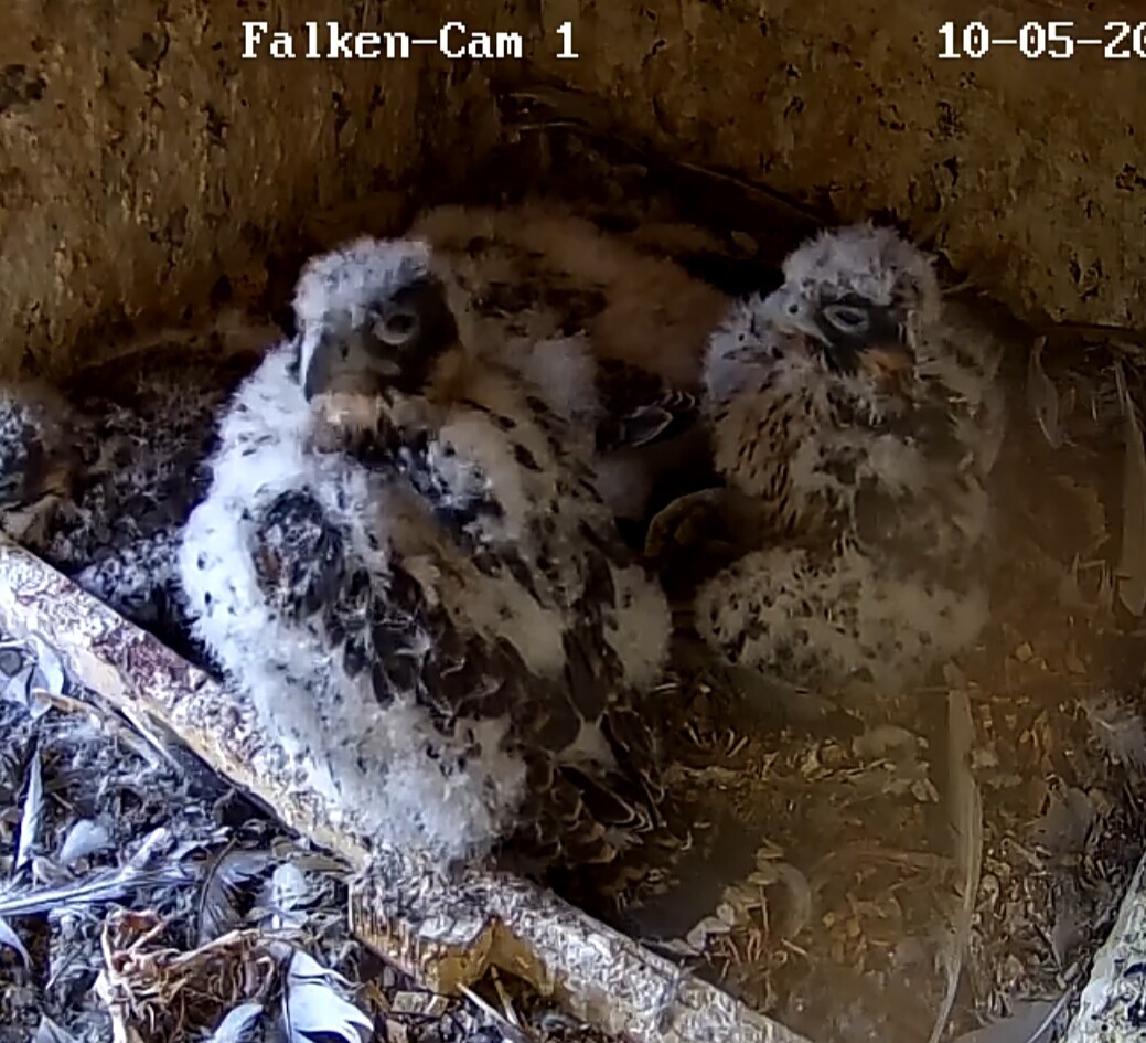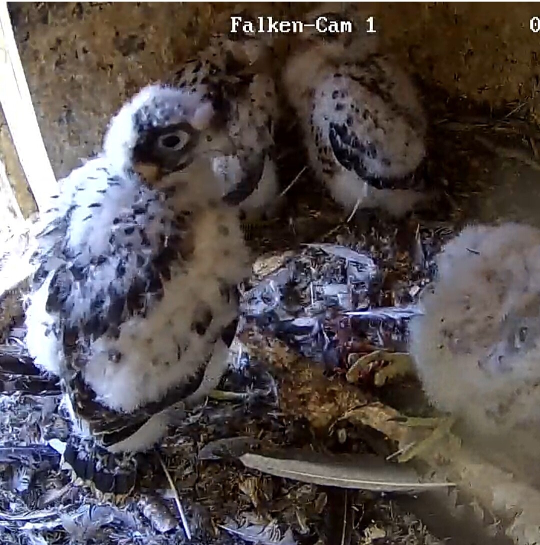 Ich habe mal nachgeschaut: letztes Jahr sind die Jungfalken am 28. Mai ausgeflogen, und dieses Jahr sind sie fast zur gleichen Zeit geschlüpft wie 2024, d.h. noch etwa 2 1/2 Wochen, bis sie ausgewachsen sein sollten.