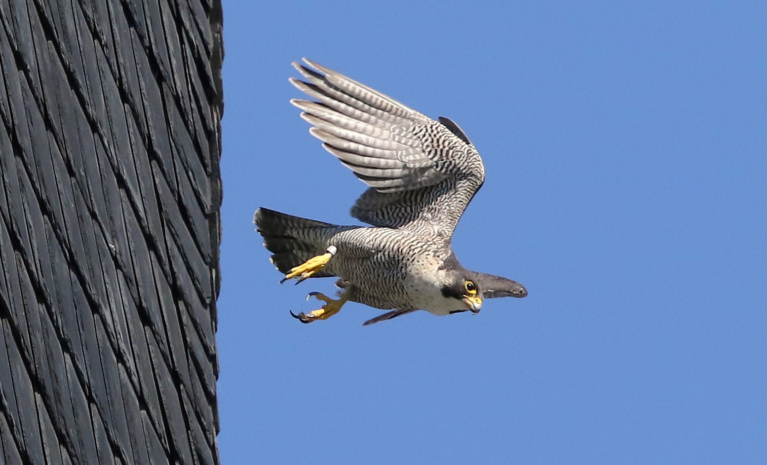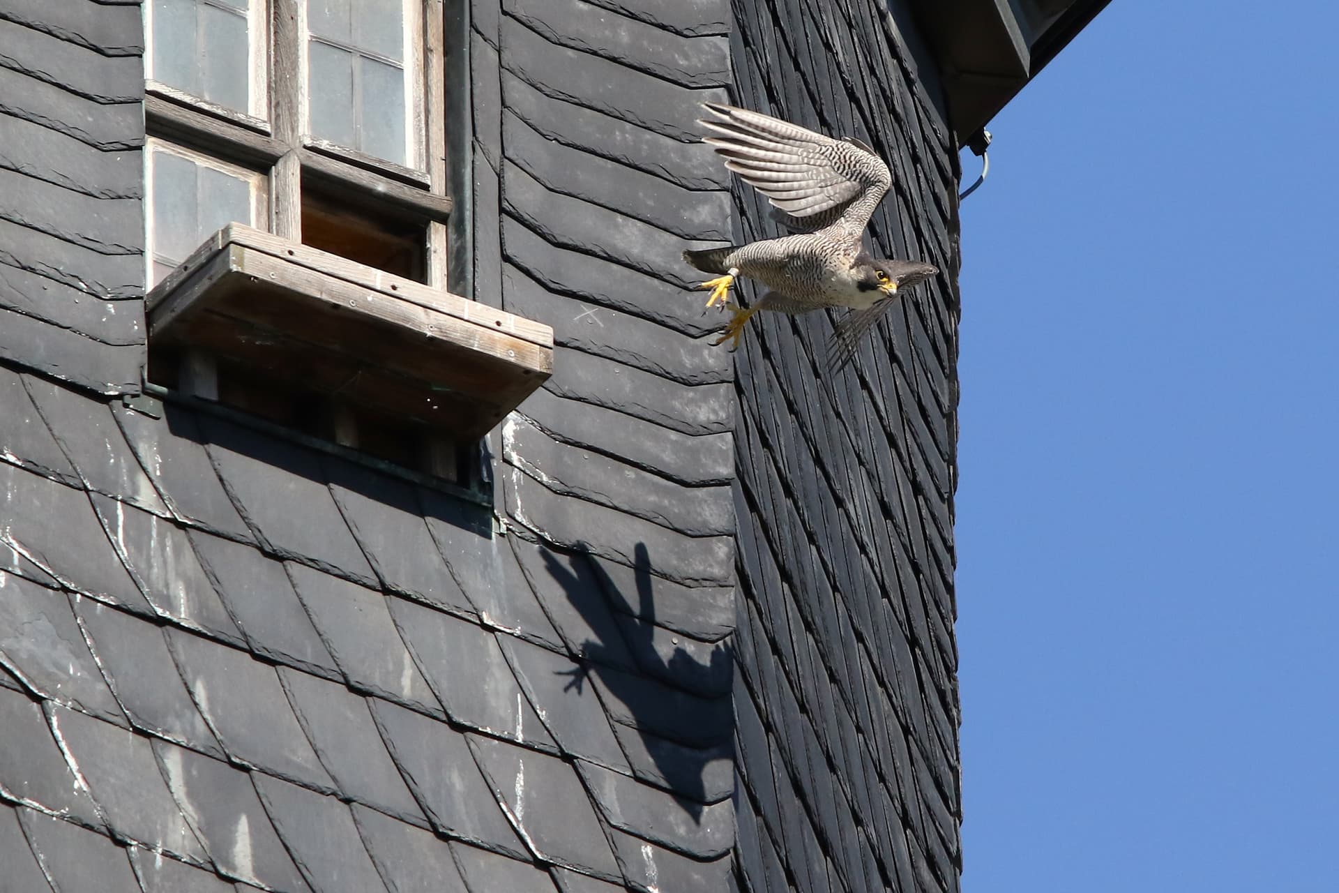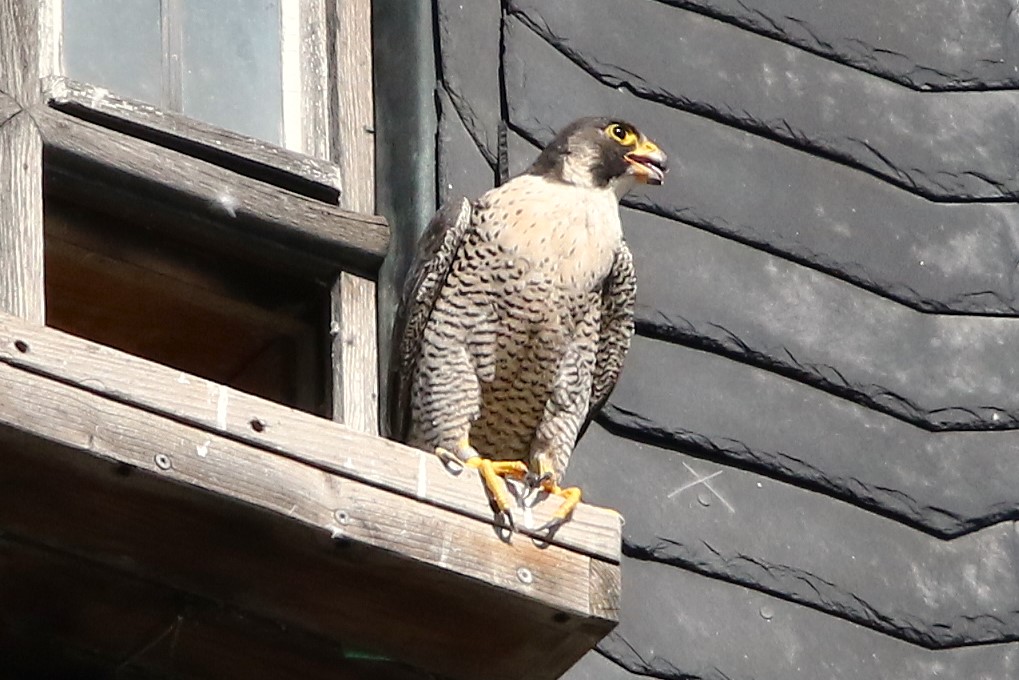 Leider gab es keine Beuteübergabe in der Luft zu sehen bzw. zu fotografieren. Falco legte den Beutevogel an der Kirche ab und flog sogleich weiter, Wanda griff sich die Beute und brachte sie sofort zum Kasten.