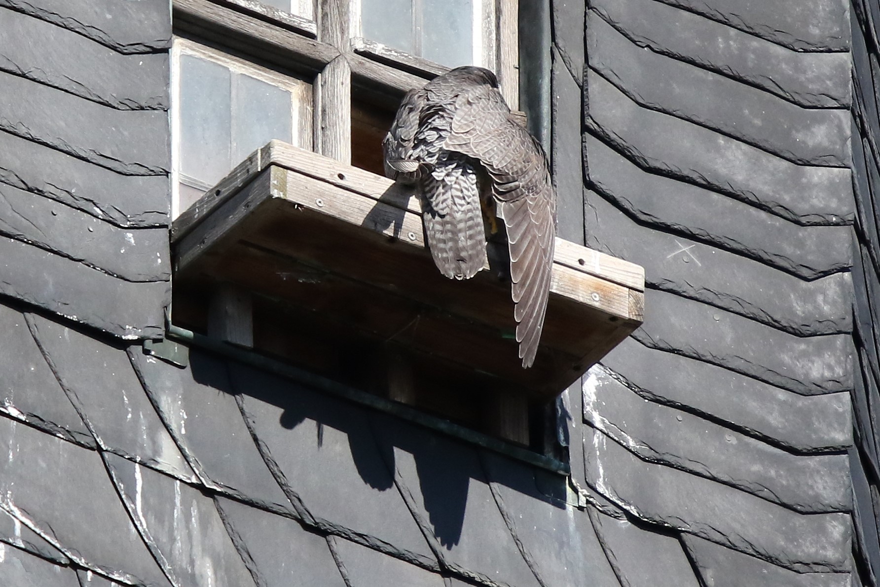 Wanda saß zunächst lange auf dem Dach des Hauptschiffs der Morizkiche. Sie putzte ihr Gefieder und dehnte sich ausgiebig, machte aber keine Anstalten loszufliegen. Sie bobachtete aber aufmerksam den Luftraum um sie herum. Also abwarten. Ich traute mich kaum, die Kamera abzusetzen und einen Schluck Kaffee zu trinken…