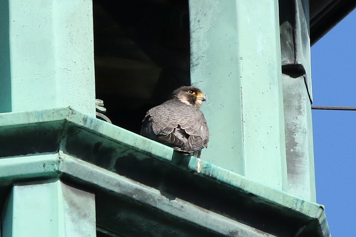 Nach einigen Minuten flog Falco dann wieder weg, und wieder etwas später kamen schließlich beide Revierfalken zusammen zur Morizkirche zurück. Wanda platzierte sich in der Kuppel und schaute etwas mürrisch in der Gegend herum.
