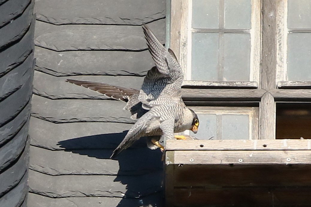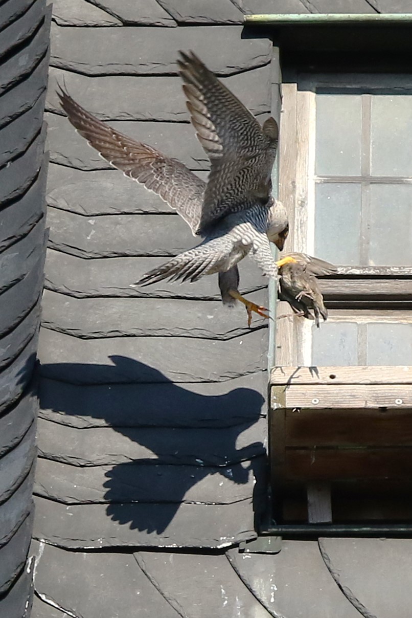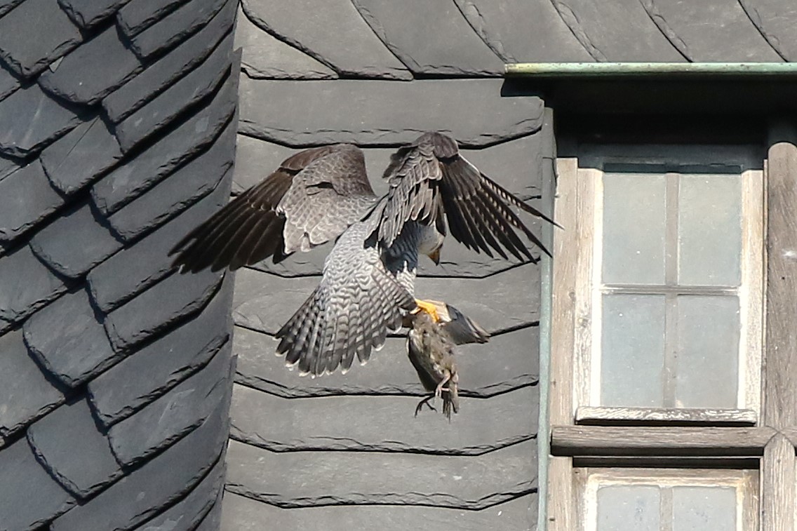 Falco kam rasant in den Kirchhof gesegelt, flog elegant eine enge Kurve und landete mitsamt erbeutetem Vogel (vermutlich ein Star oder eine Amsel) auf dem Anflugbrett.