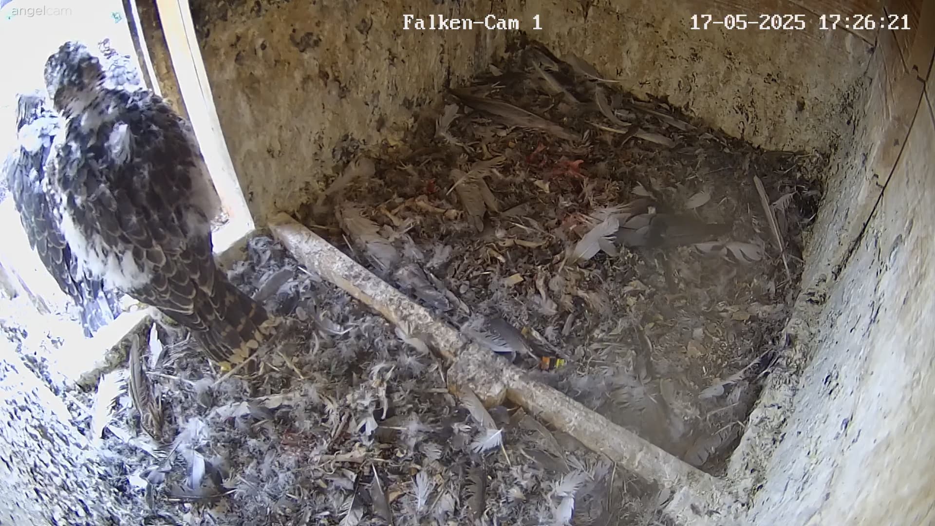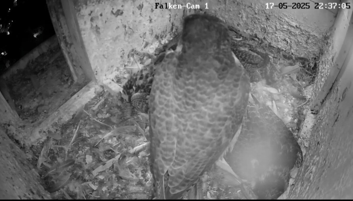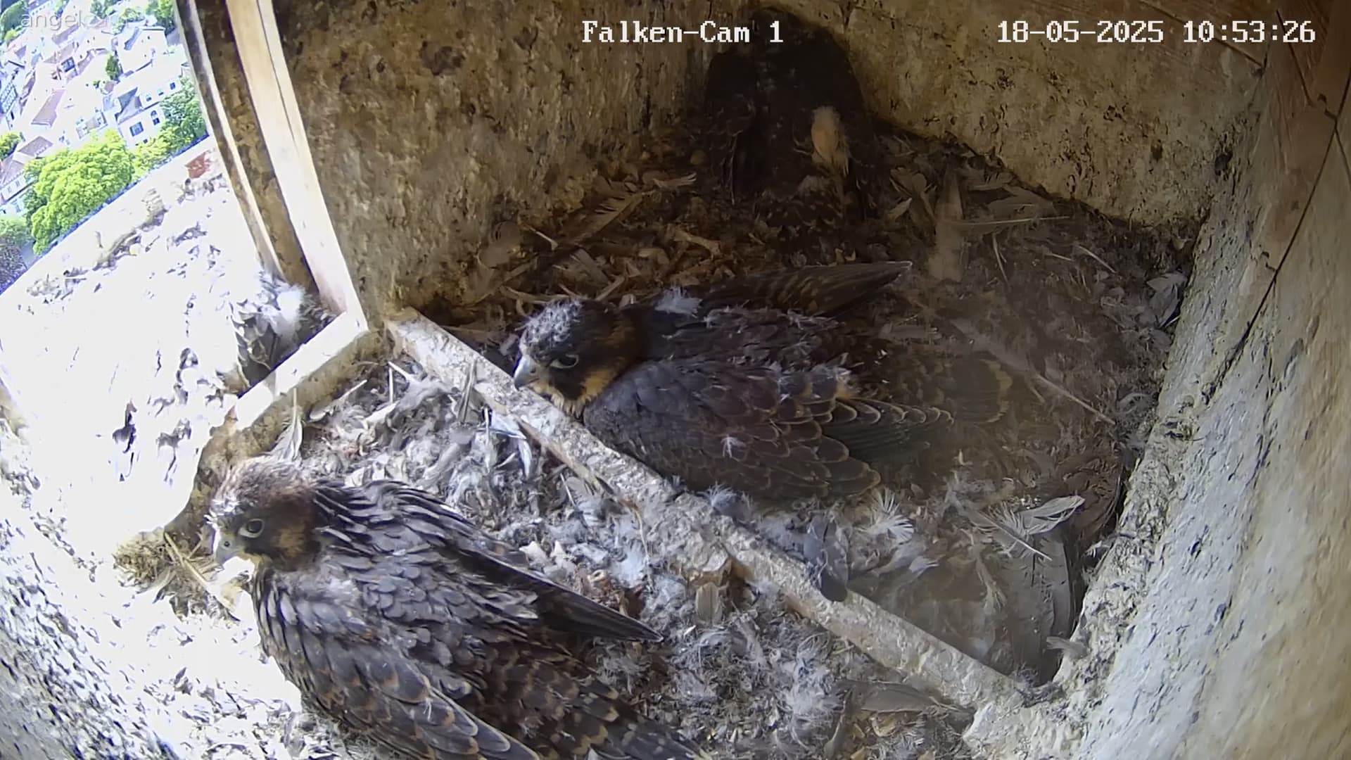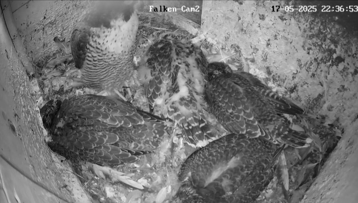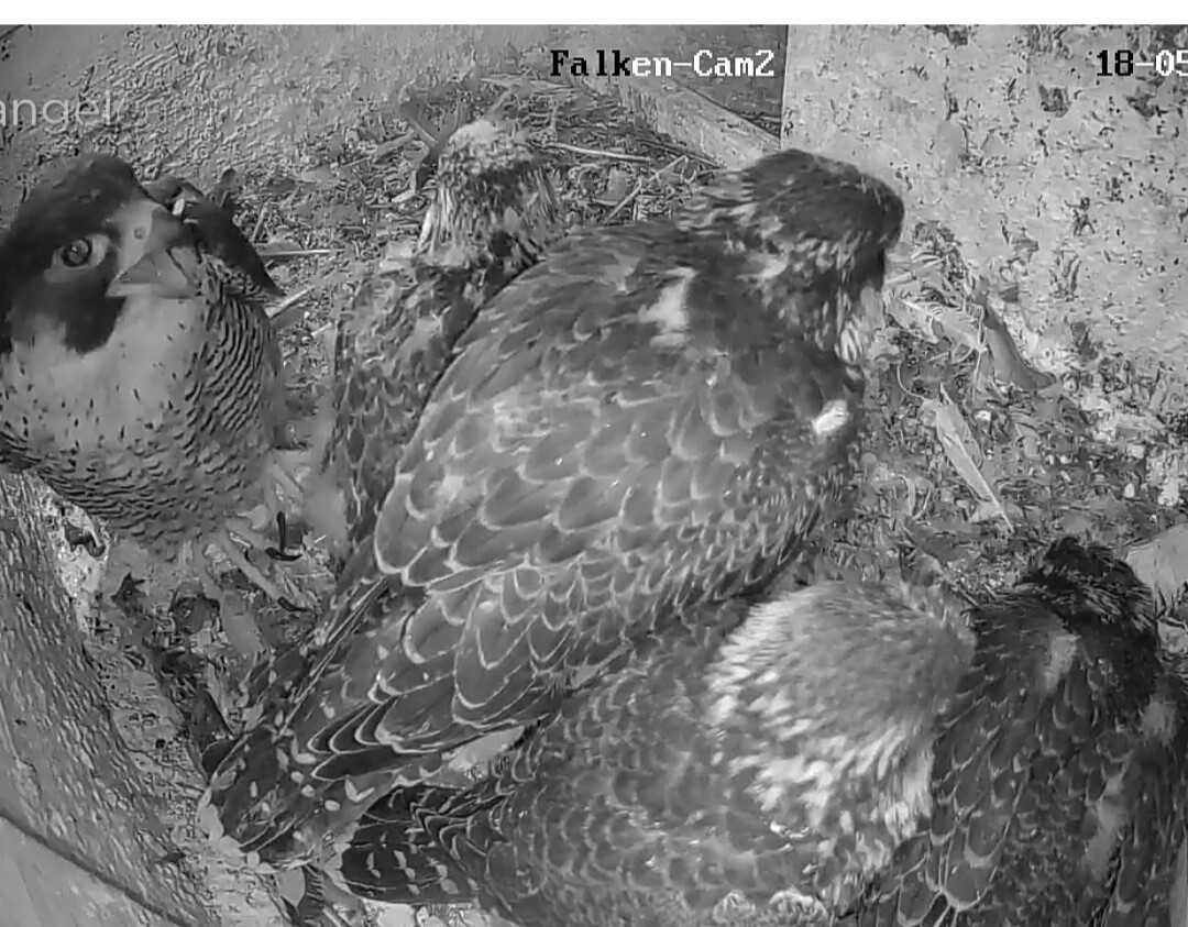 Ja, Deine Einschätzung teile ich. Vor ein paar Tagen war noch ein erheblicher Größenunterschied zwischen Wanda und den Jungfalken zu sehen, und der scheint nun von Tag zu Tag kleiner zu werden. Bis Ende Mai werden sie ihre volle Größe erreicht haben, dann fliegen sie nämlich aus.