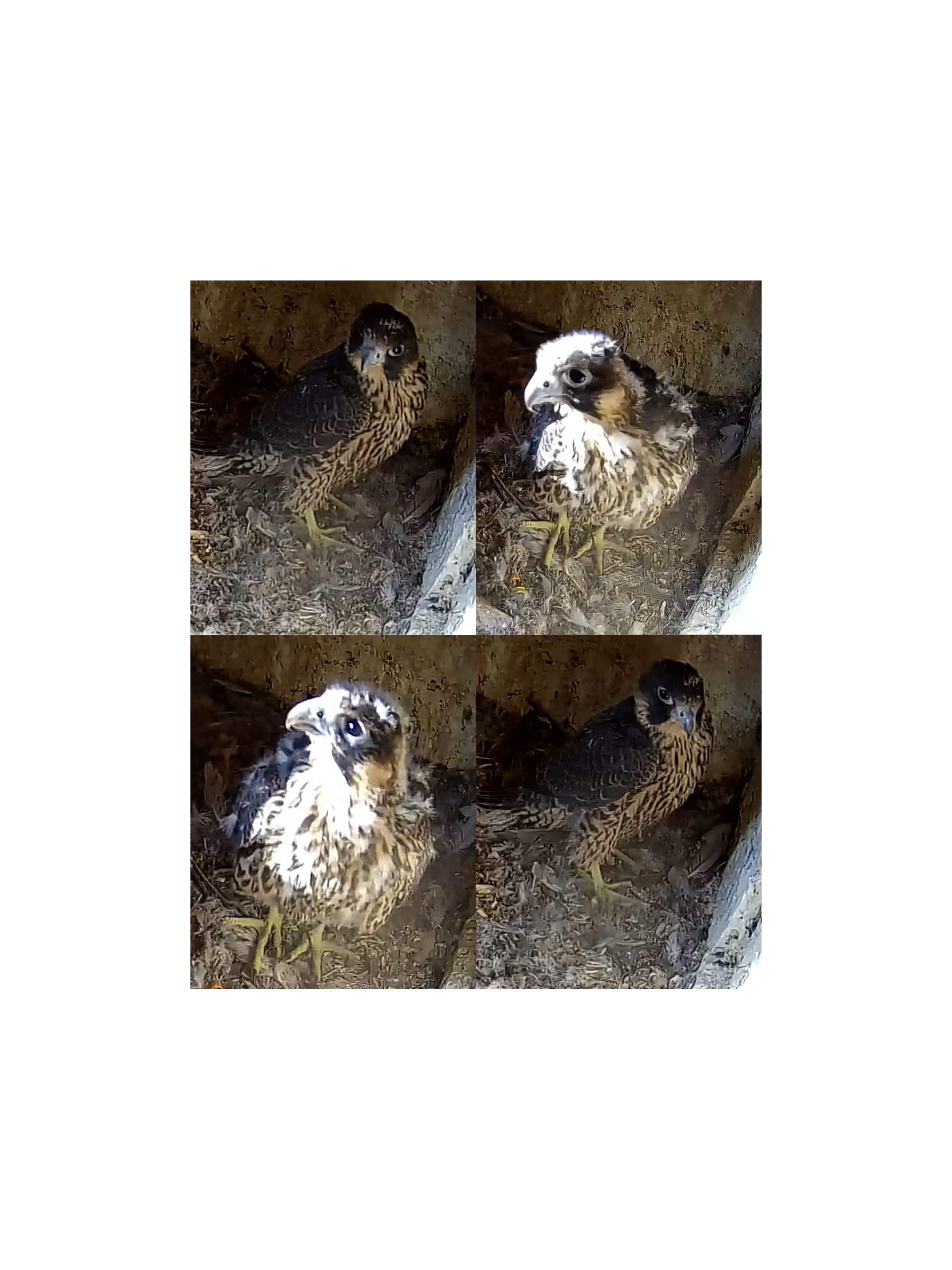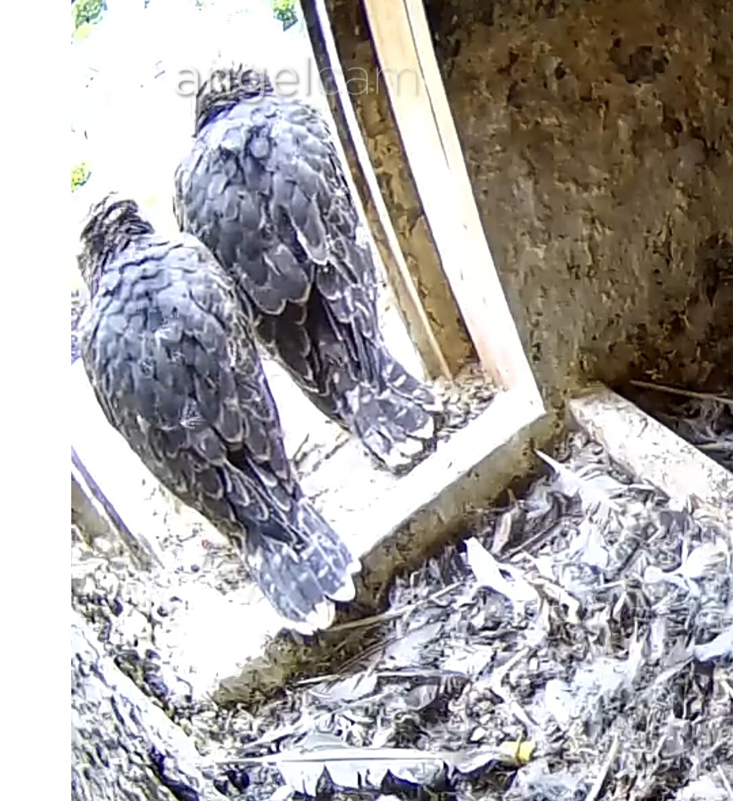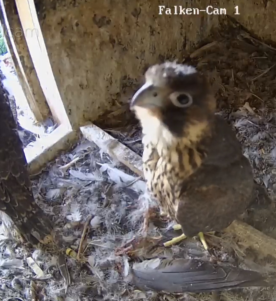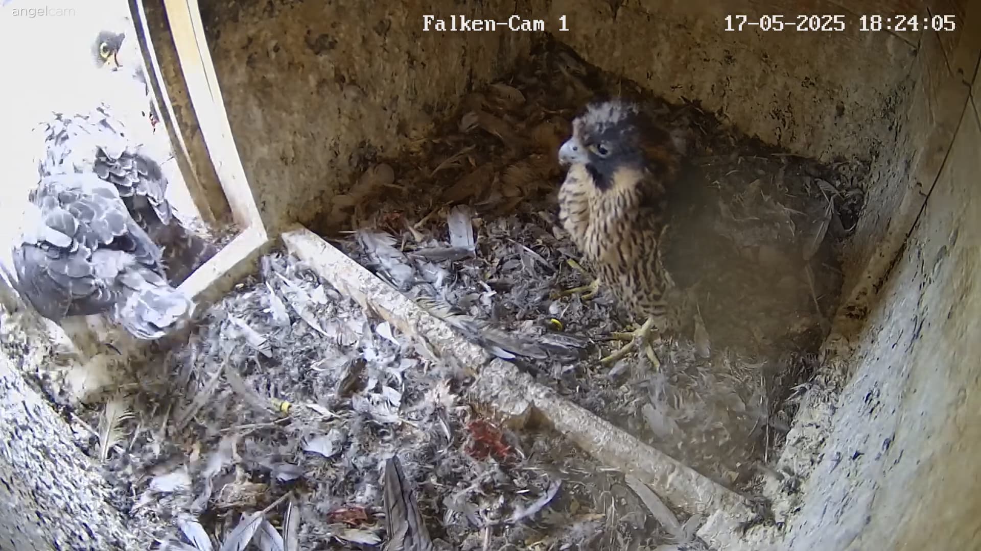 Ja, Deine Einschätzung teile ich. Vor ein paar Tagen war noch ein erheblicher Größenunterschied zwischen Wanda und den Jungfalken zu sehen, und der scheint nun von Tag zu Tag kleiner zu werden. Bis Ende Mai werden sie ihre volle Größe erreicht haben, dann fliegen sie nämlich aus.