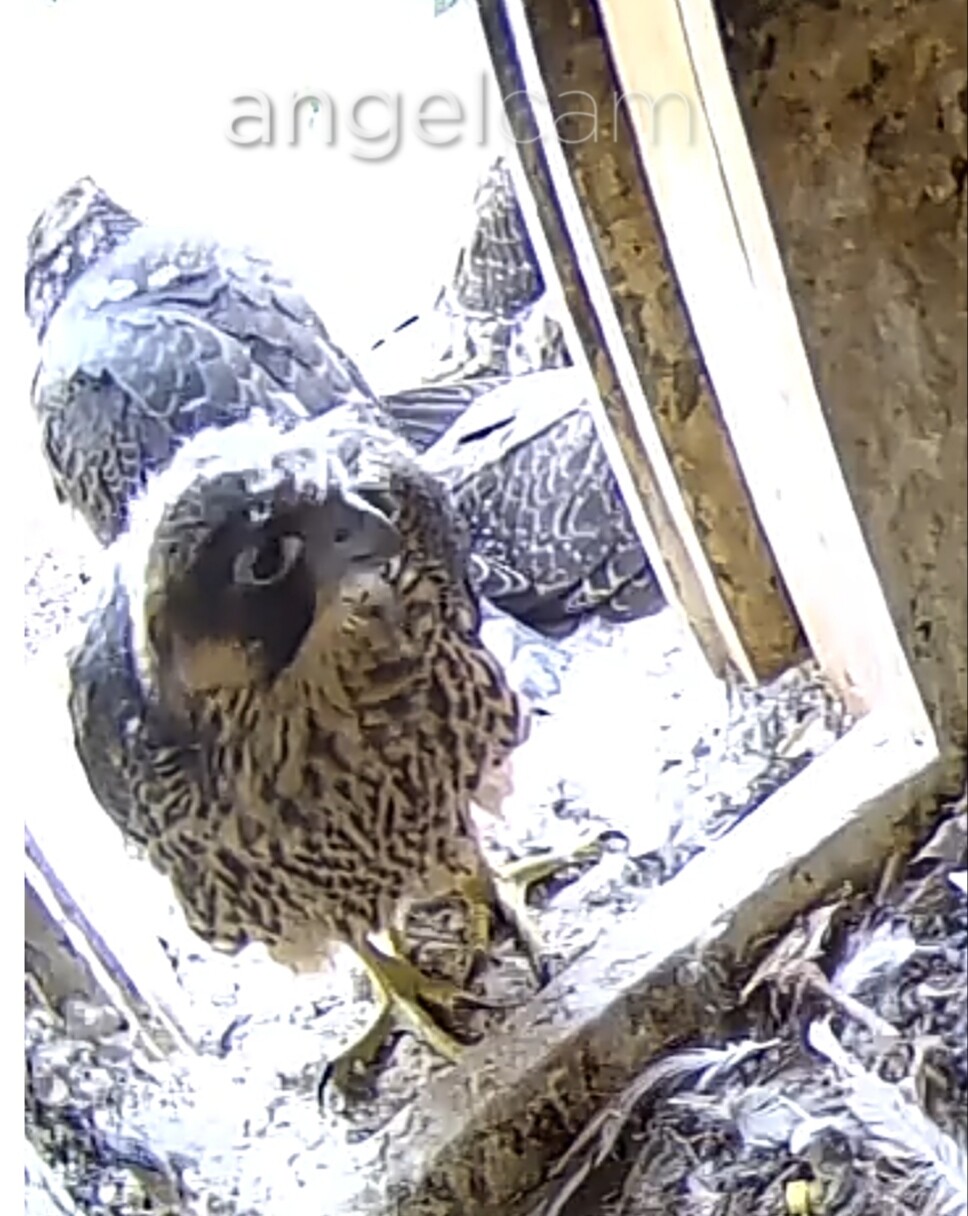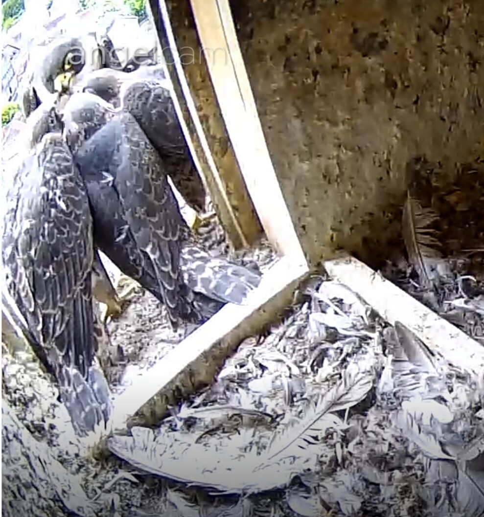 Gerade zankten sich zwei Jungfalken im Kasten um ein zähes Stück Beuterest. Sie haben es sich gegenseitig immer wieder weggeschnappt, natürlich alles mit viel Geschrei unterlegt.