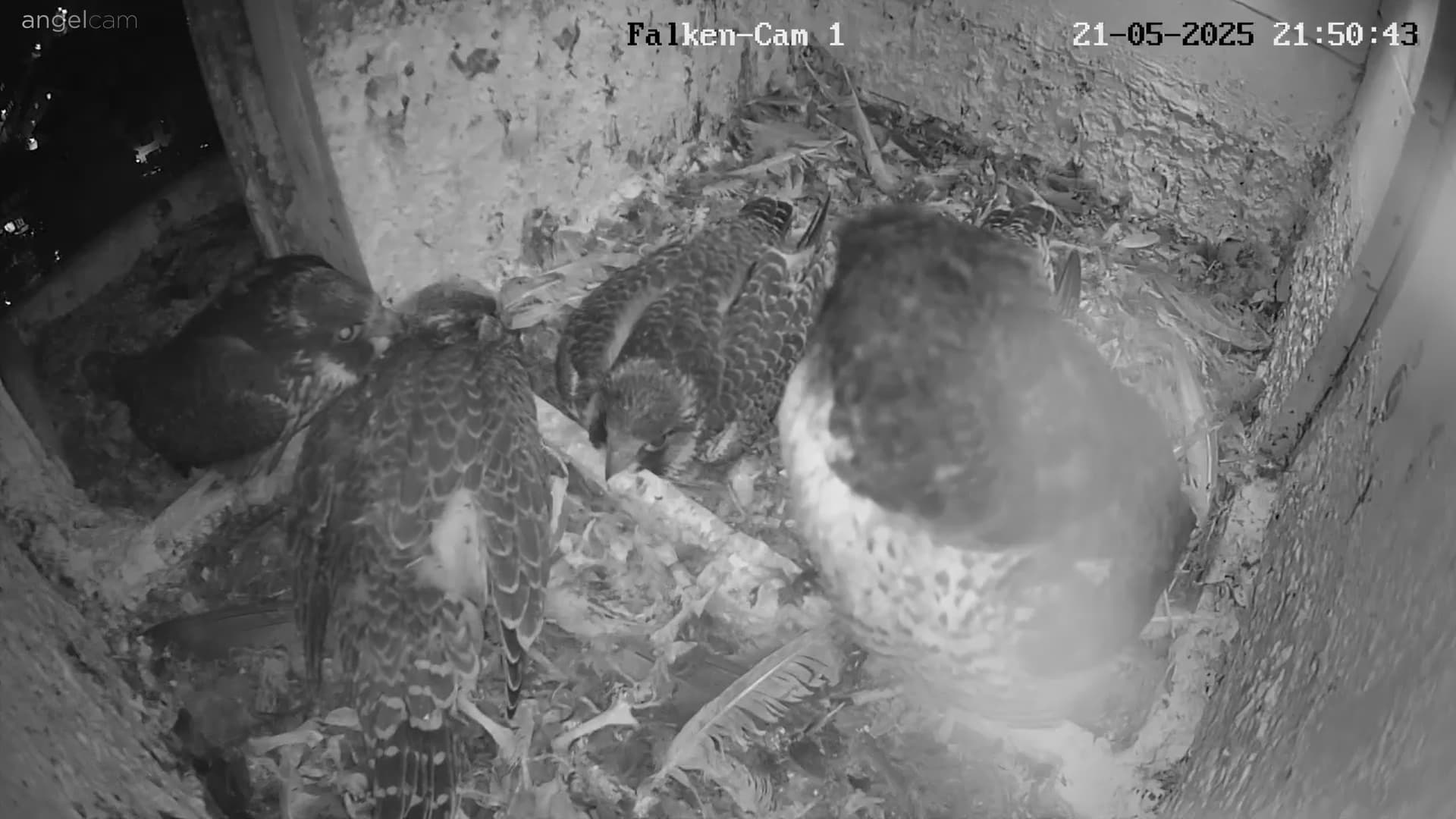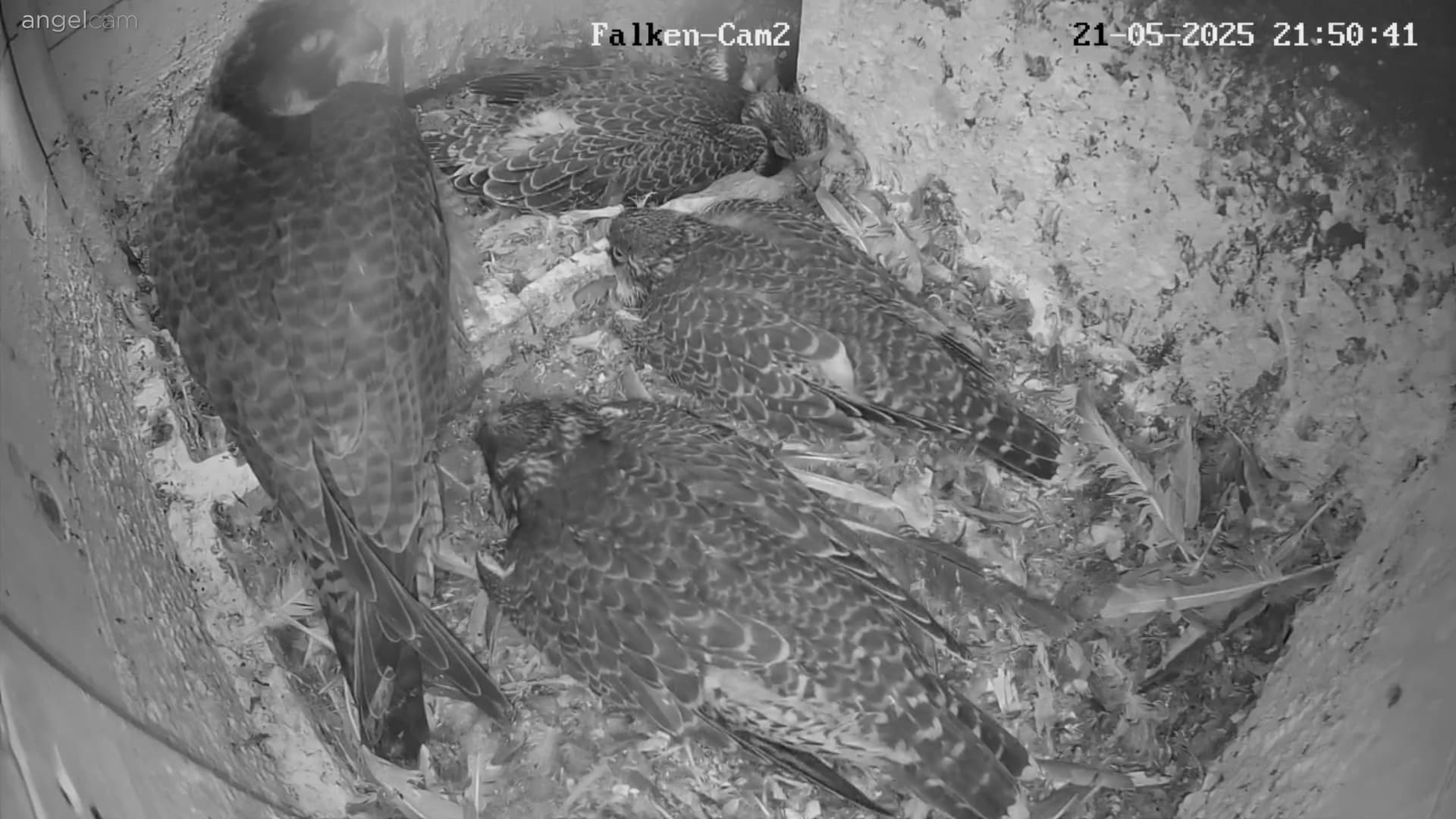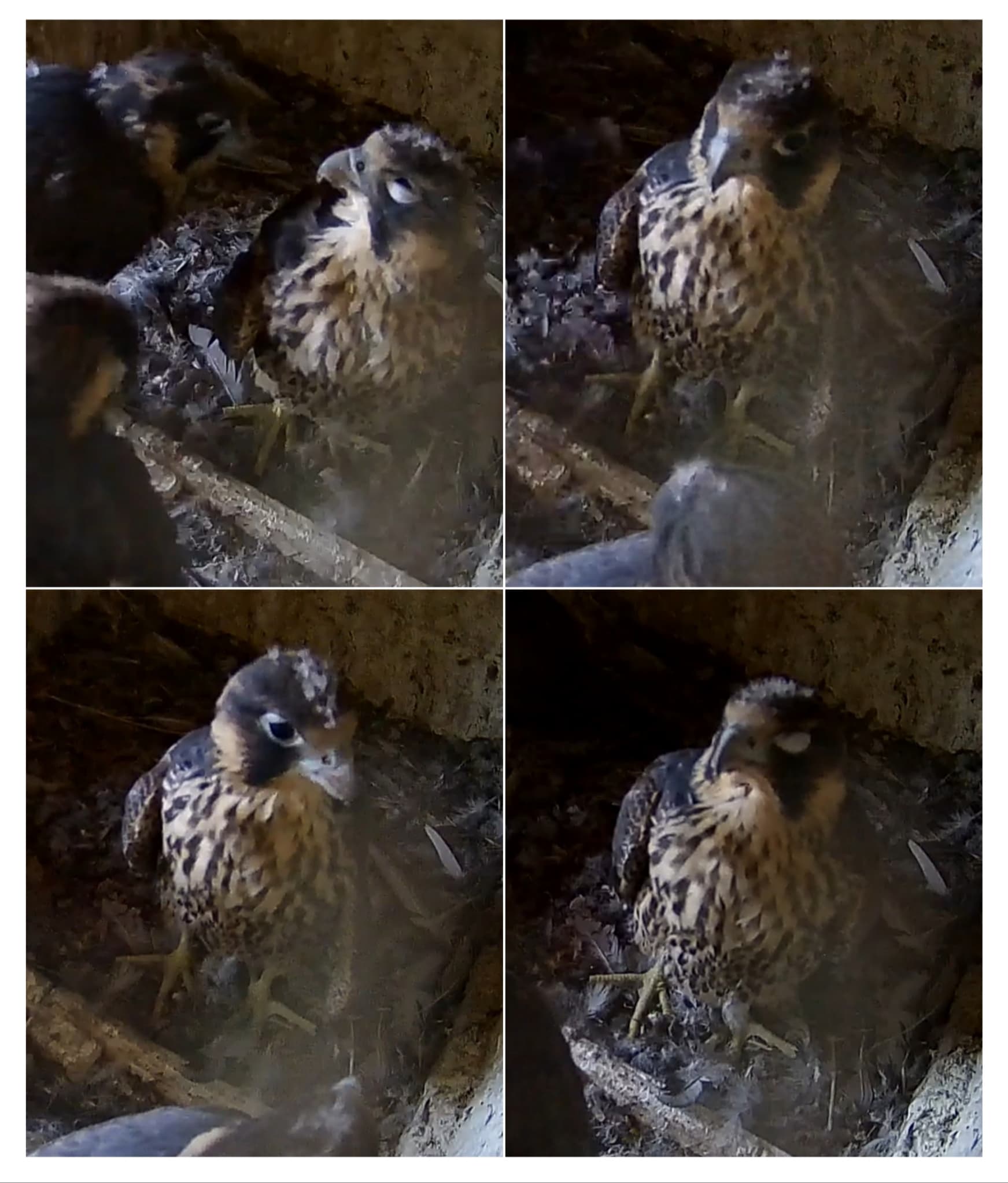 Gerade füttert einer der Altvögel und ich sehe nur 3 der Jungfalken.