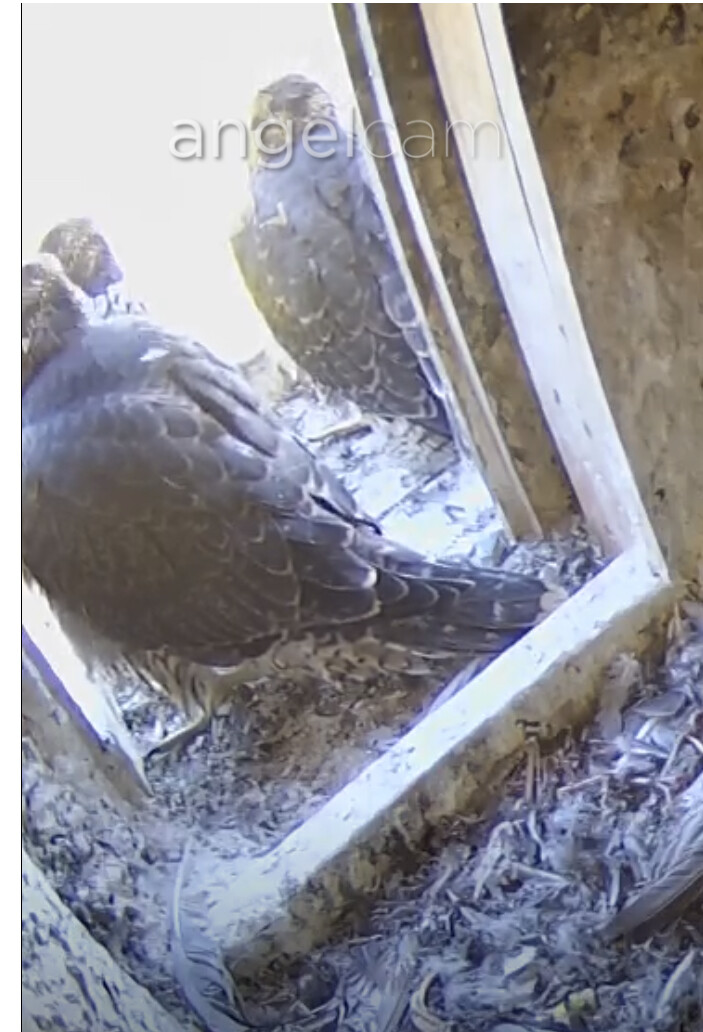 Heute früh scheint der erste der Jungfalken ausgeflogen zu sein, jedenfalls konnte ich vom Kirchhof aus und via Webcam nie mehr als drei gleichzeitig sehen; und die machen auch konkrete Anstalten, alsbald nach draußen zu starten.