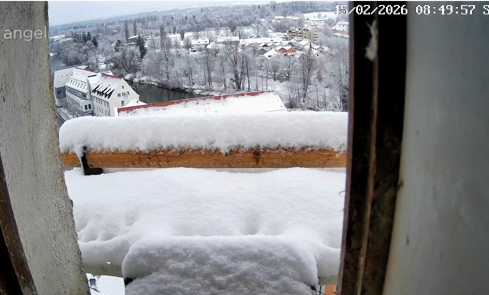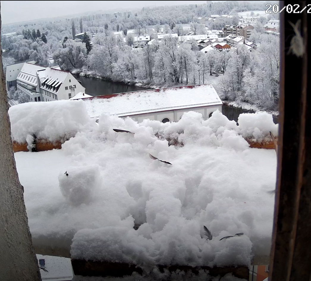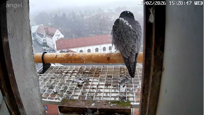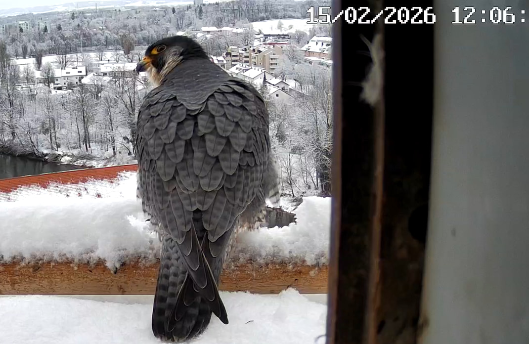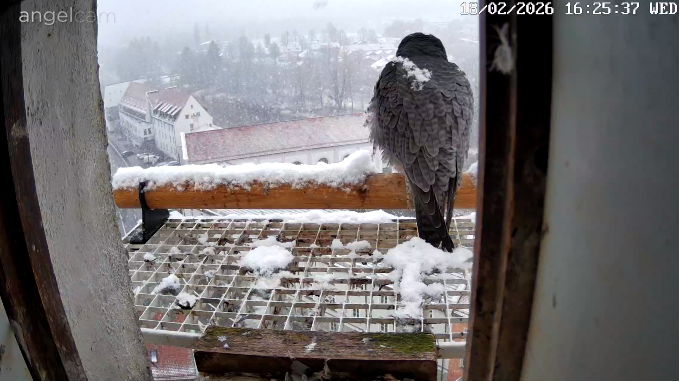 Nachtrag 16:25 - er (ich nehme zumindest an, dass es Magnus ist) sitzt immer noch - auf der Sitzstange neben ihm häuft sich langsam der Schnee.
