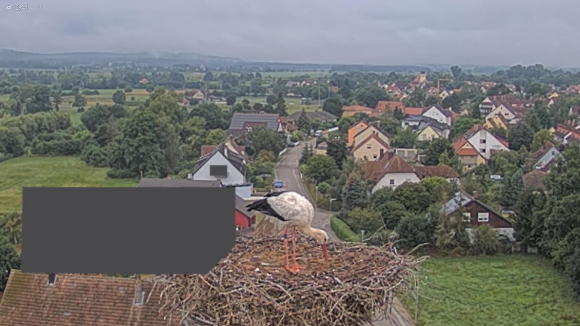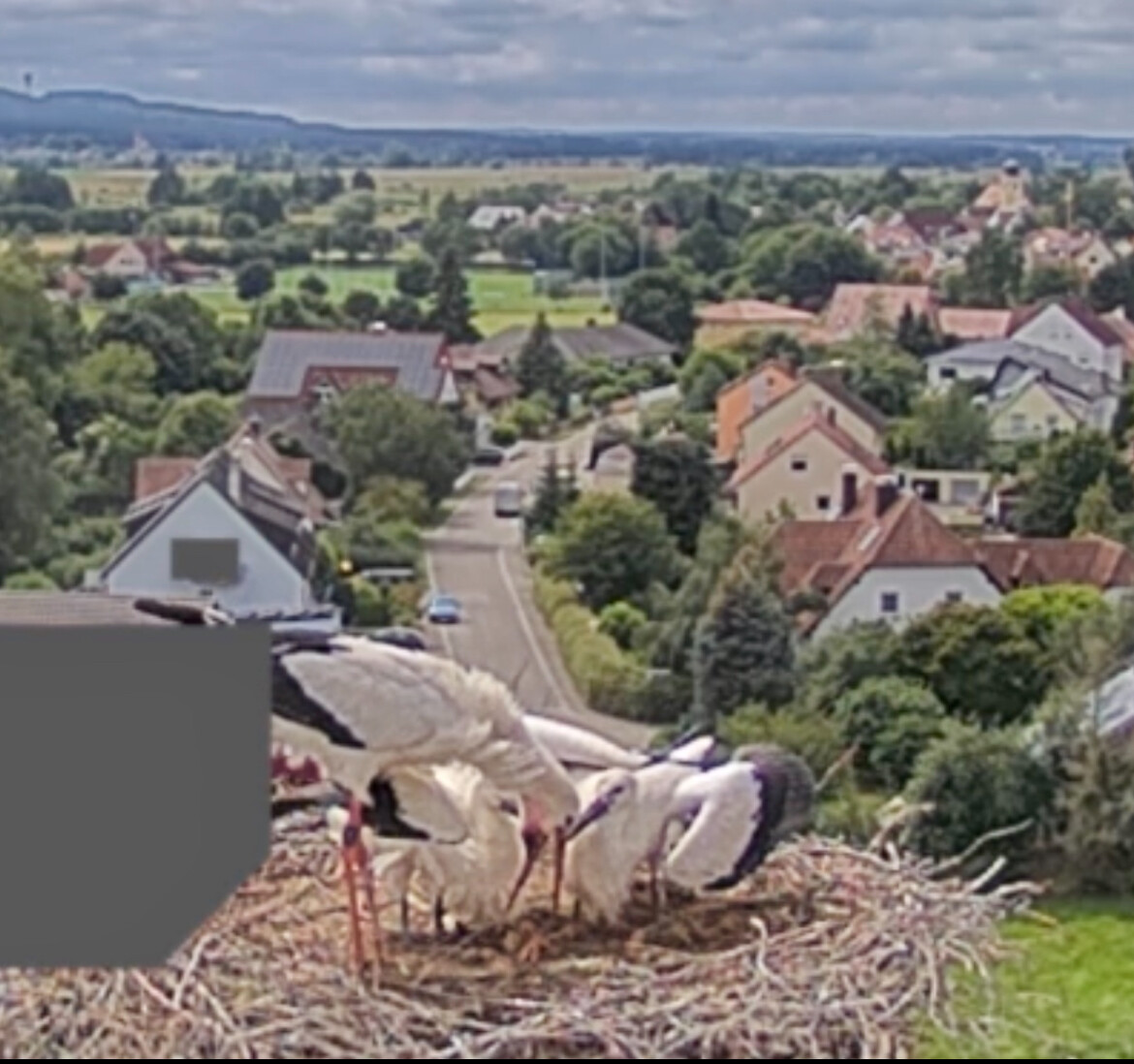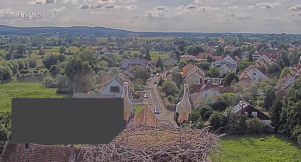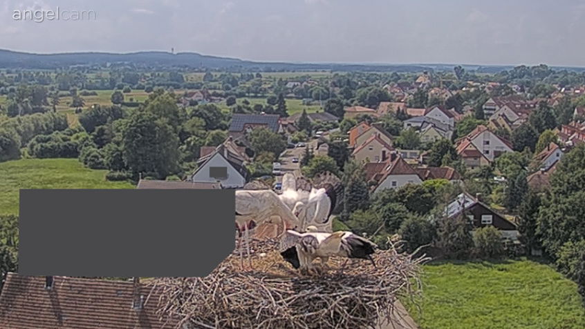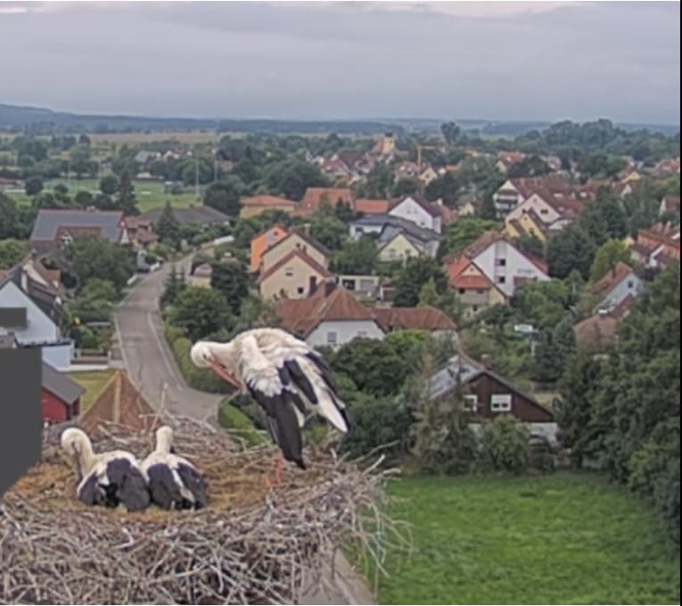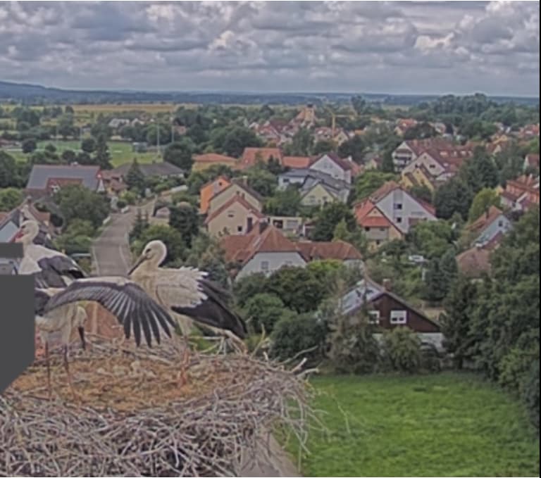 Am Montag hat ein Jungstorch den ersten Rundflug ums Nest unternommen. Das 1. Bild ist von Montag früh, das 2. Bild vom Mittag und das 3. Bild von der Landung gerade eben.