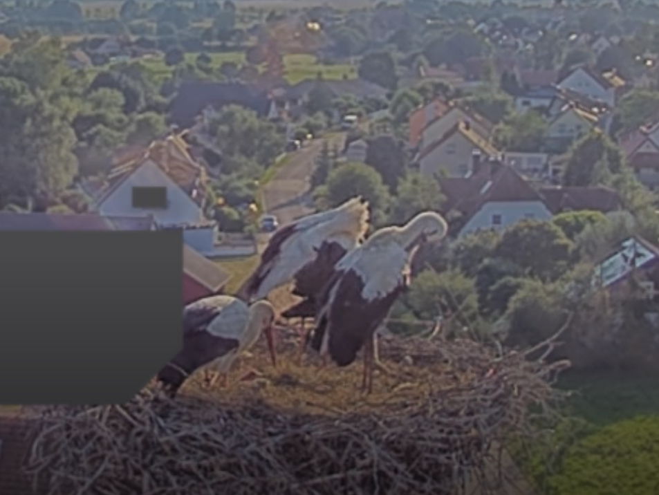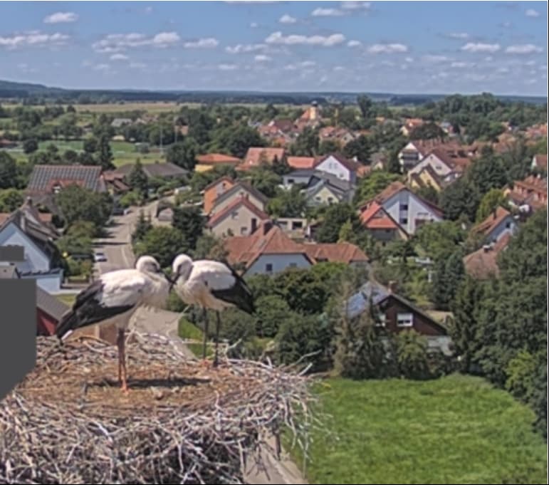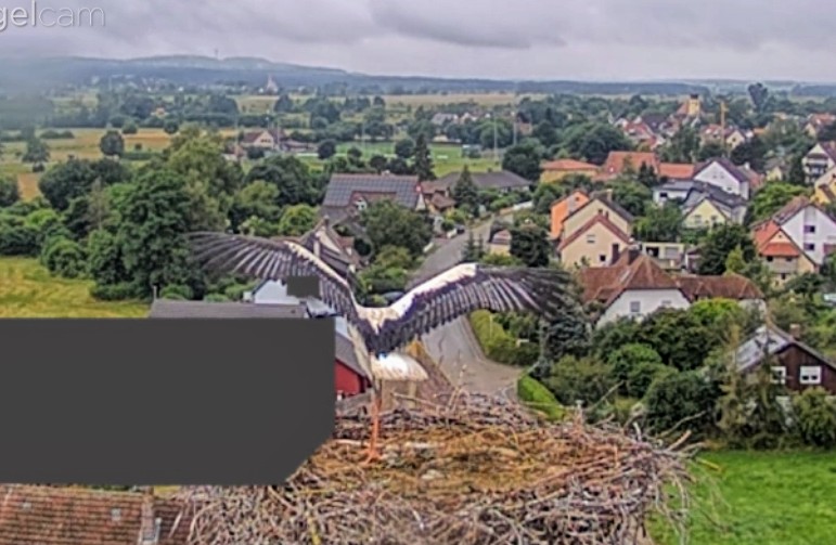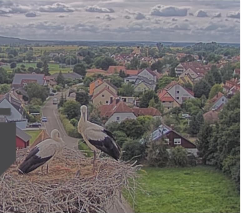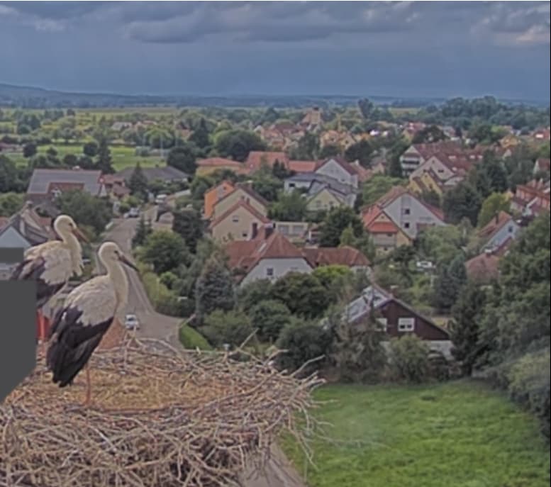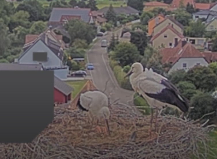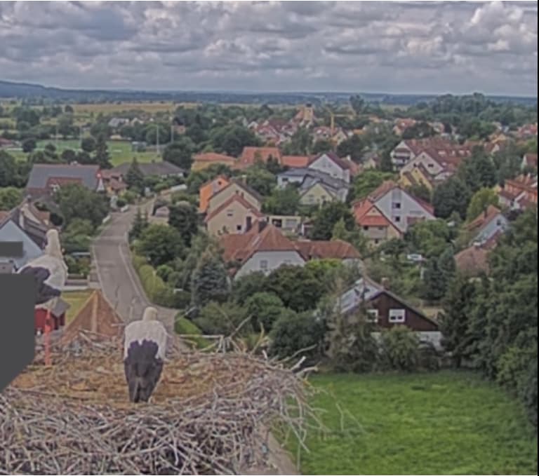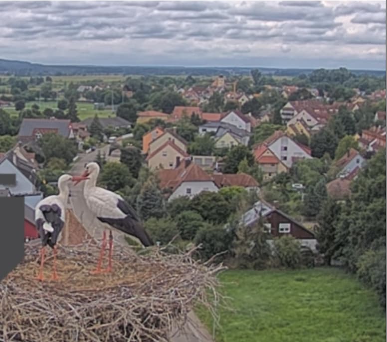Am Montag hat ein Jungstorch den ersten Rundflug ums Nest unternommen. Das 1. Bild ist von Montag früh, das 2. Bild vom Mittag und das 3. Bild von der Landung gerade eben.