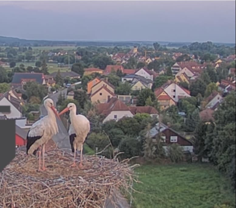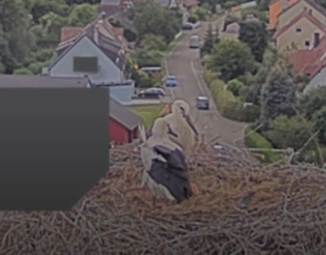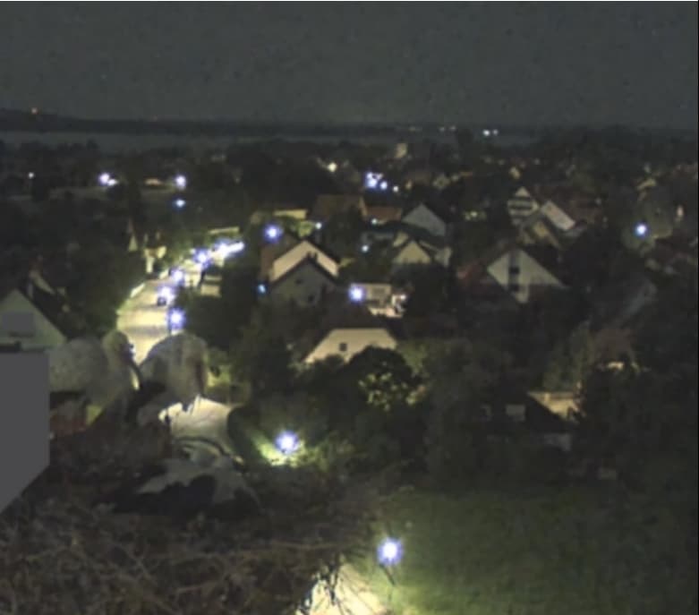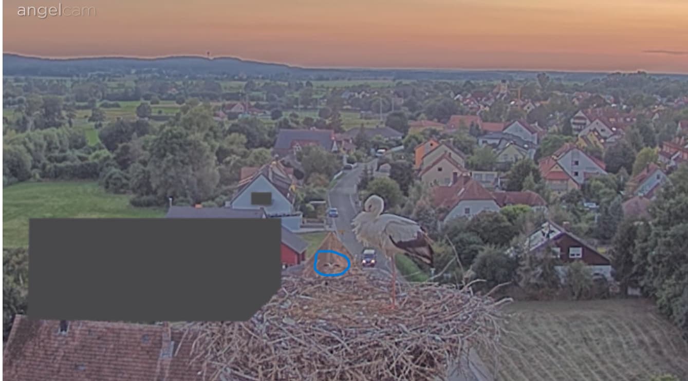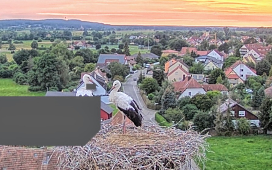 21:00 Heut hat sich auf dem Hausdach direkt hinter dem Nest sichtbar, ein Storch zur Nachtruhe niedergelassen. Hätte ich ihn nicht anfliegen gesehen, hätte ich ihn nicht bemerkt