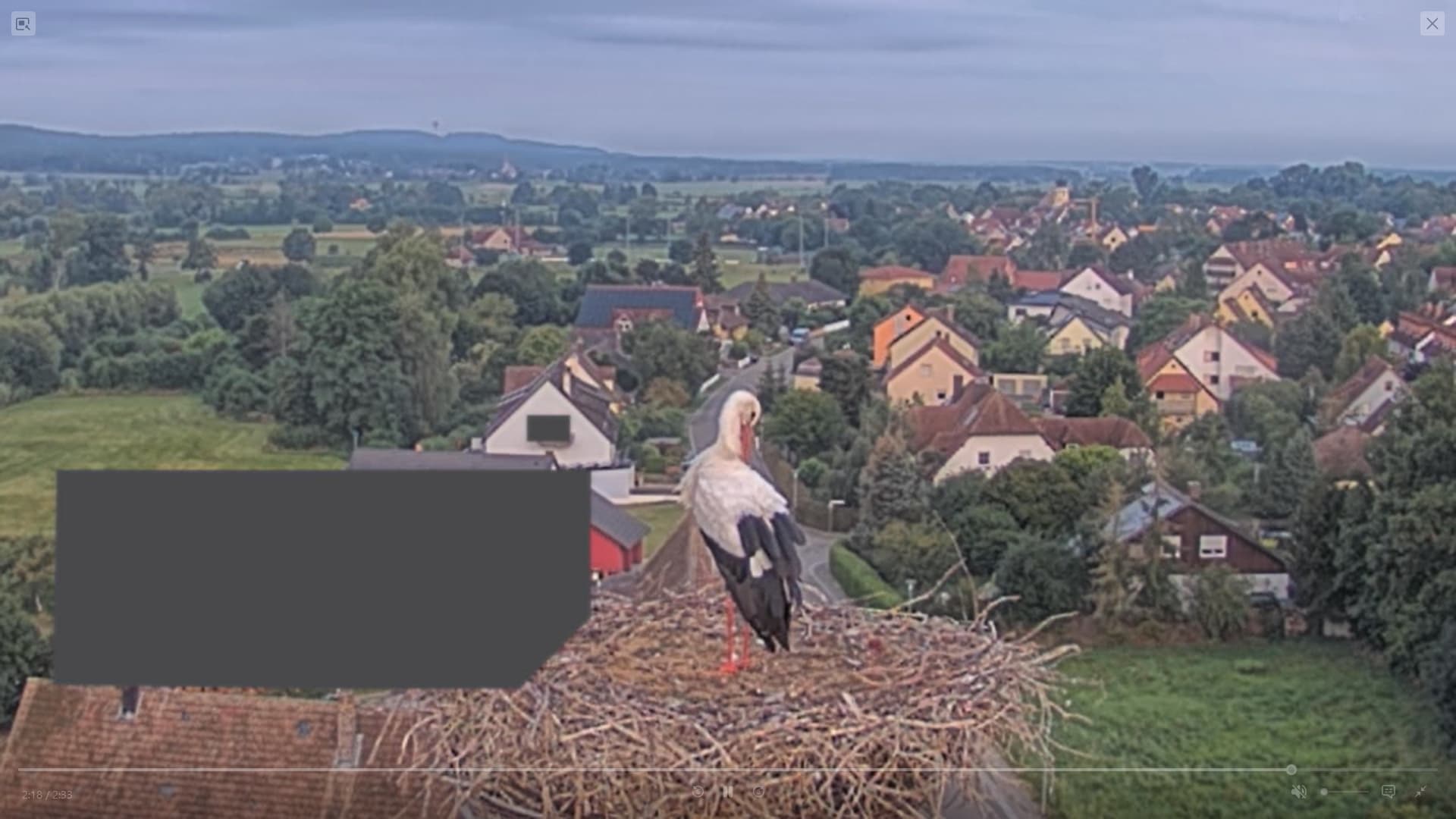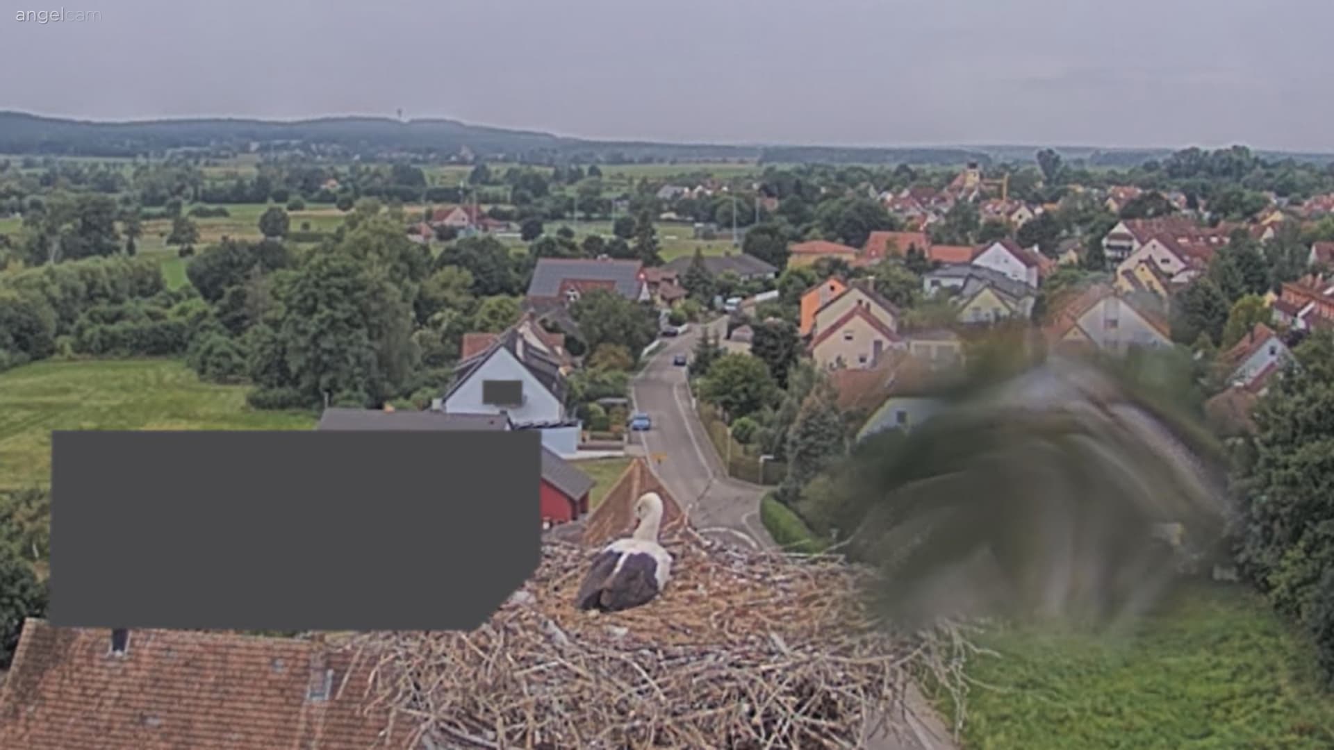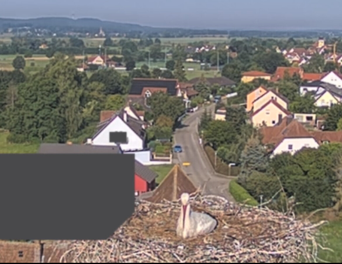 21:00 Heut hat sich auf dem Hausdach direkt hinter dem Nest sichtbar, ein Storch zur Nachtruhe niedergelassen. Hätte ich ihn nicht anfliegen gesehen, hätte ich ihn nicht bemerkt
