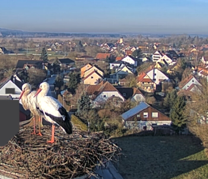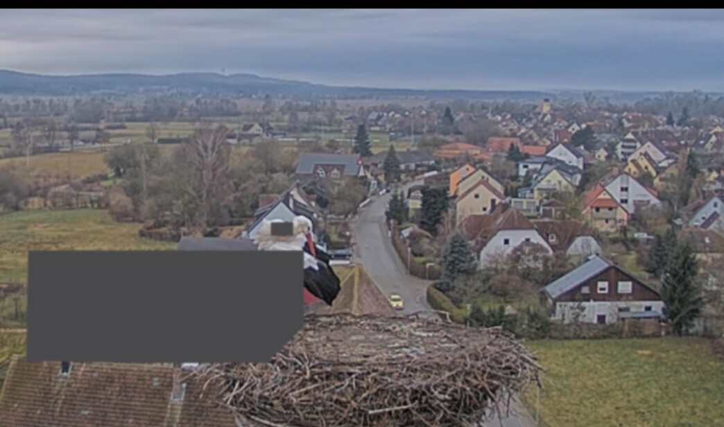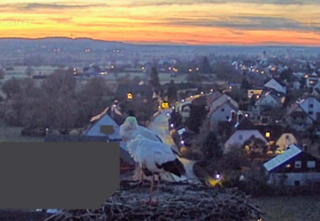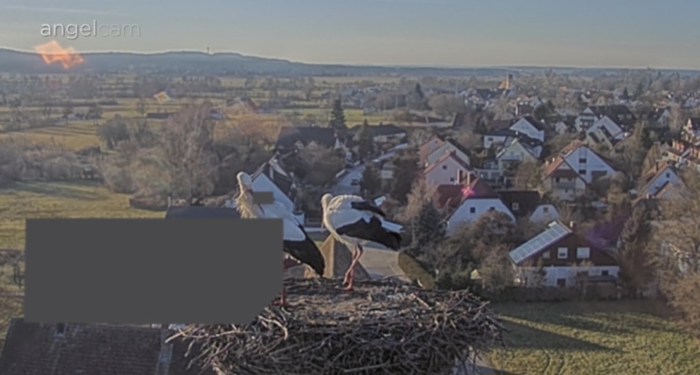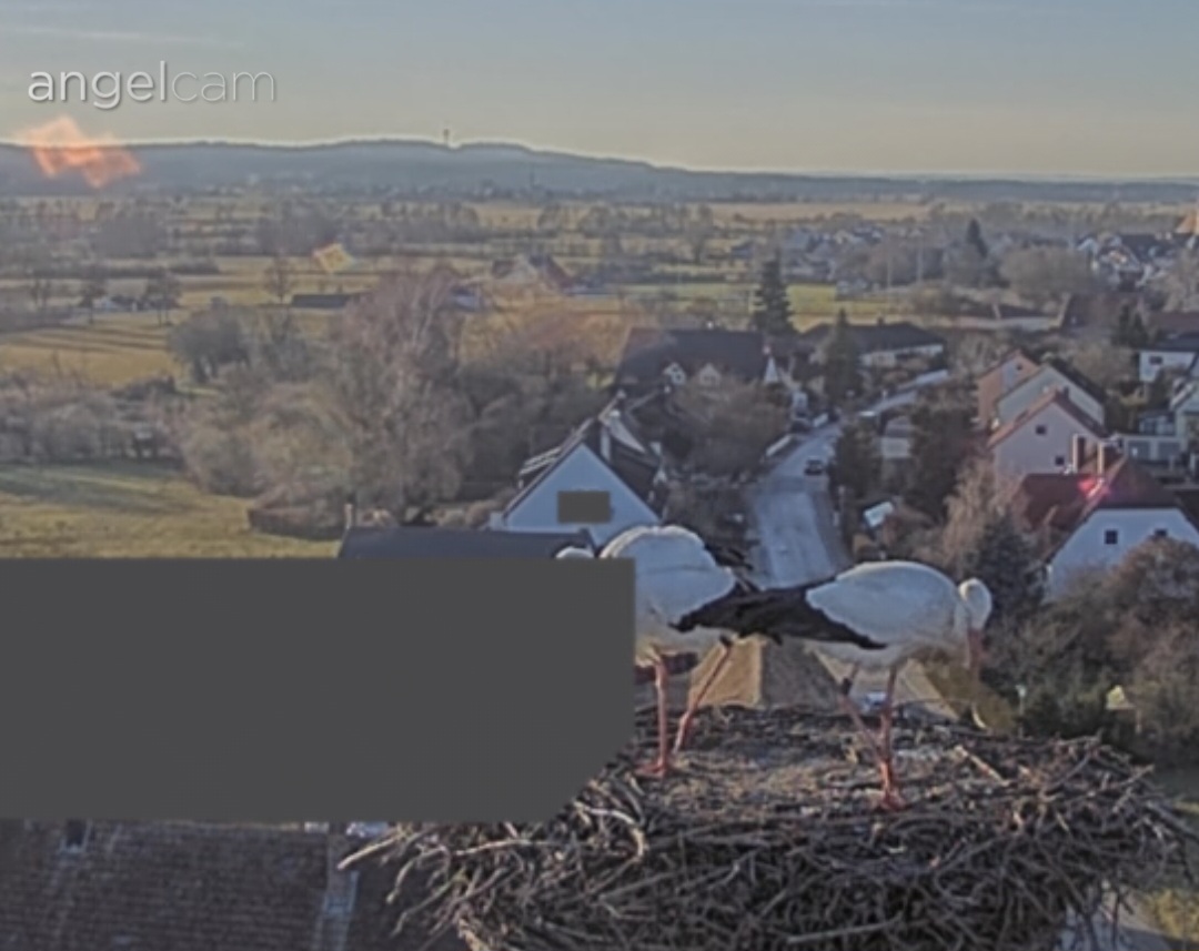 Vorhin war kurz ein unberingter Fremdstorch im Nest, war leider zu langsam für einen Screenshot. Franzi kam sofort an und vertrieb den Storch. Ein paar Sekunden später landete dann auch Jakob. Sie blieben für ca. 20 Min. und flogen wieder ab.