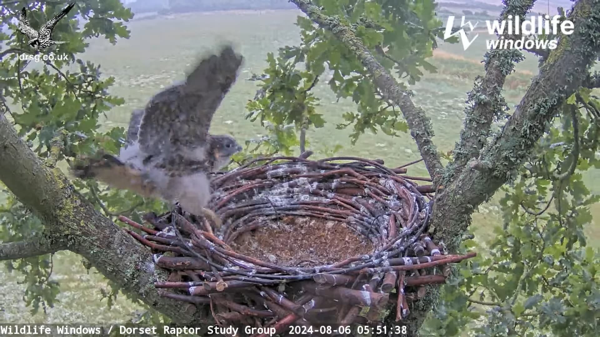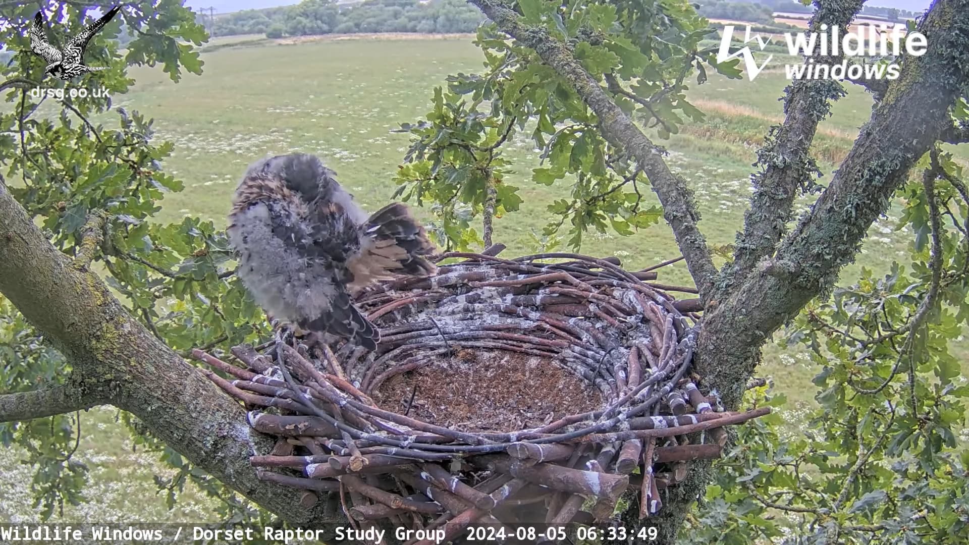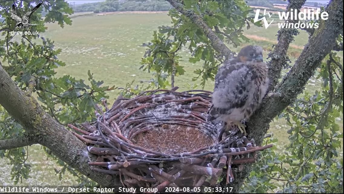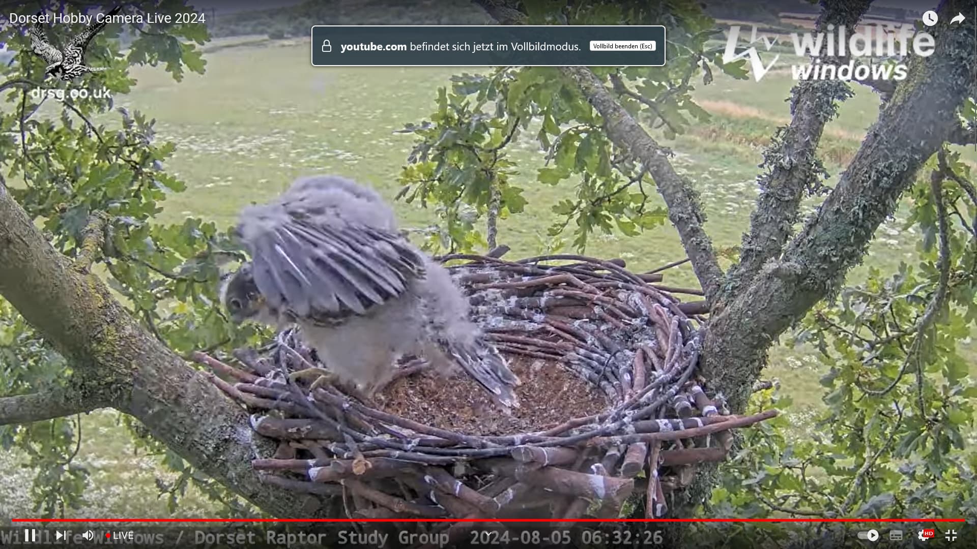 Es ist erstaunlich, mit welcher Selbstverständlichkeit das kleine Hobblet jetzt auf dem Nestrand sitzt und sich putzt! Sogar auf einem Fuß ist es kurz gestanden! Und beim Wuchs der Federn kann man fast zuschauen