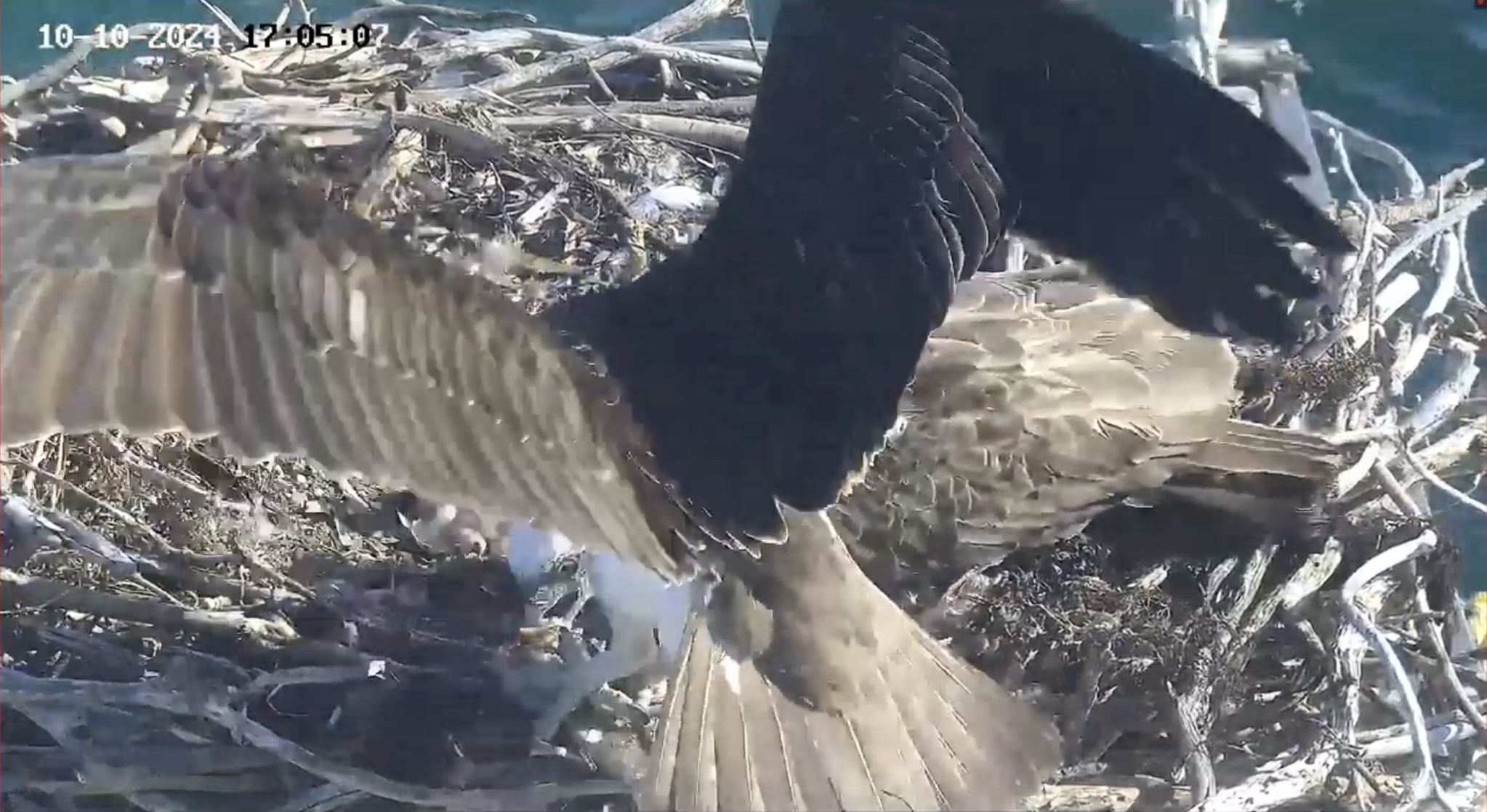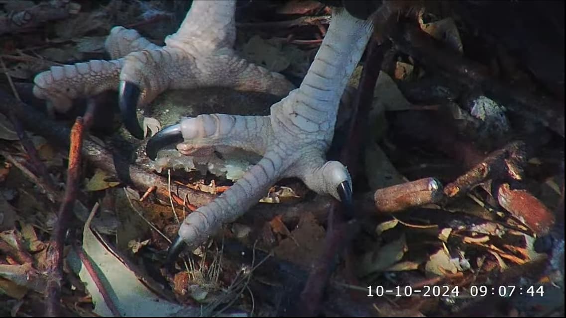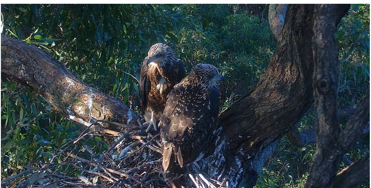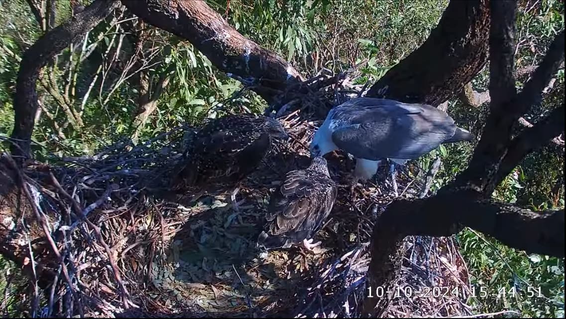Bei den jungen Weißbauchseeadlern konnte man am 10.10. morgens sehen, wie sich SE 33 eine gebrachte Beute schnappte und allein fraß. Tagsüber gab es dann noch mehrere Fütterungen für beide Jungvögel.