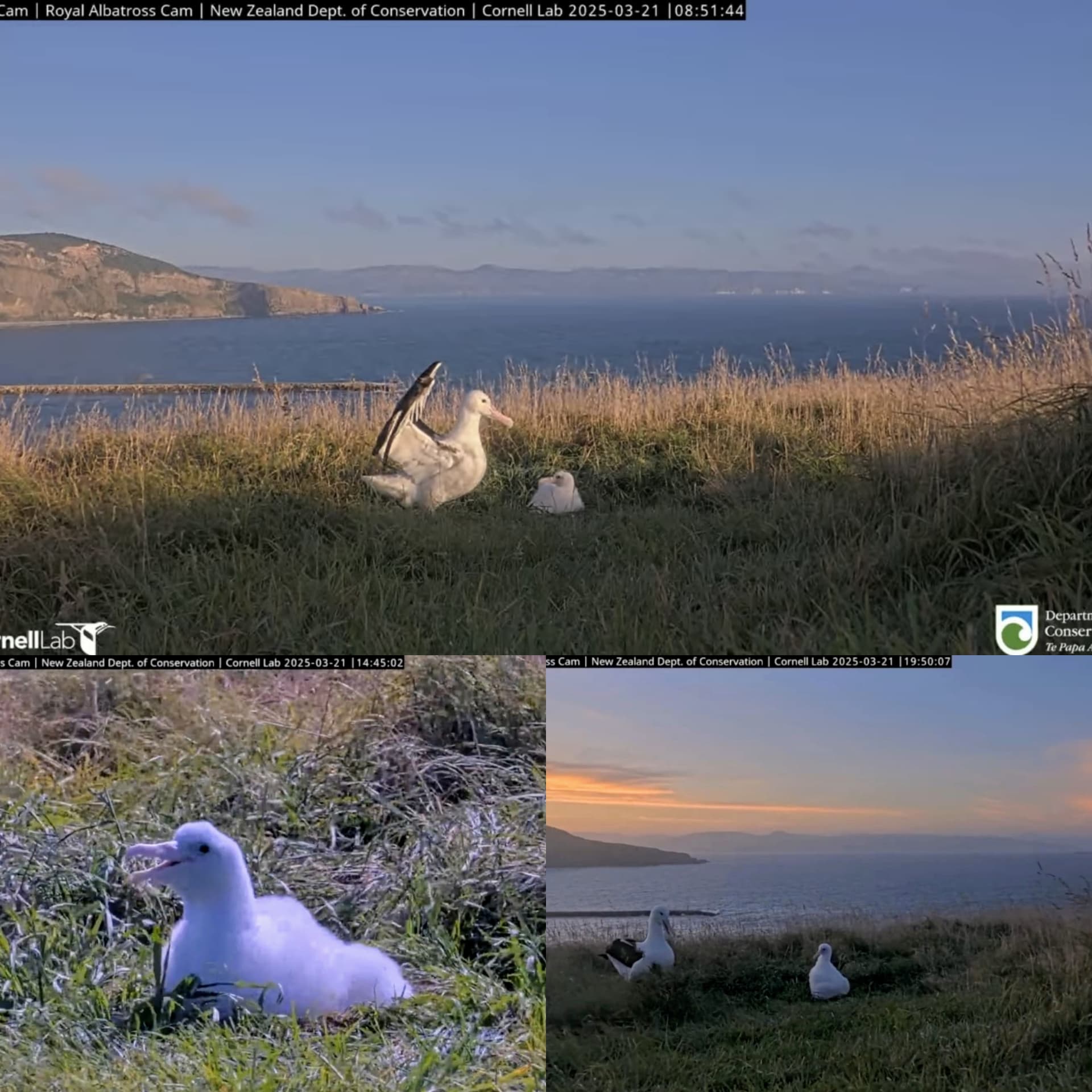 RLK kommt heute schon am frühen Vormittag zur Fütterung, SSTrig schlummert noch. Sie wacht auf und sie plaudern ein wenig, bevor er zu füttern anfängt. Tagsüber hält sich die Kleine etwas entfernt im hohen Gras auf, kehrt aber immer wieder zum Nest zurück. In Neuseeland beginnt nun der Herbst und die Tage werden kürzer. Es fängt schon an dunkel zu werden, da kommt nochmal eines der Elterntiere zur Abendfütterung.