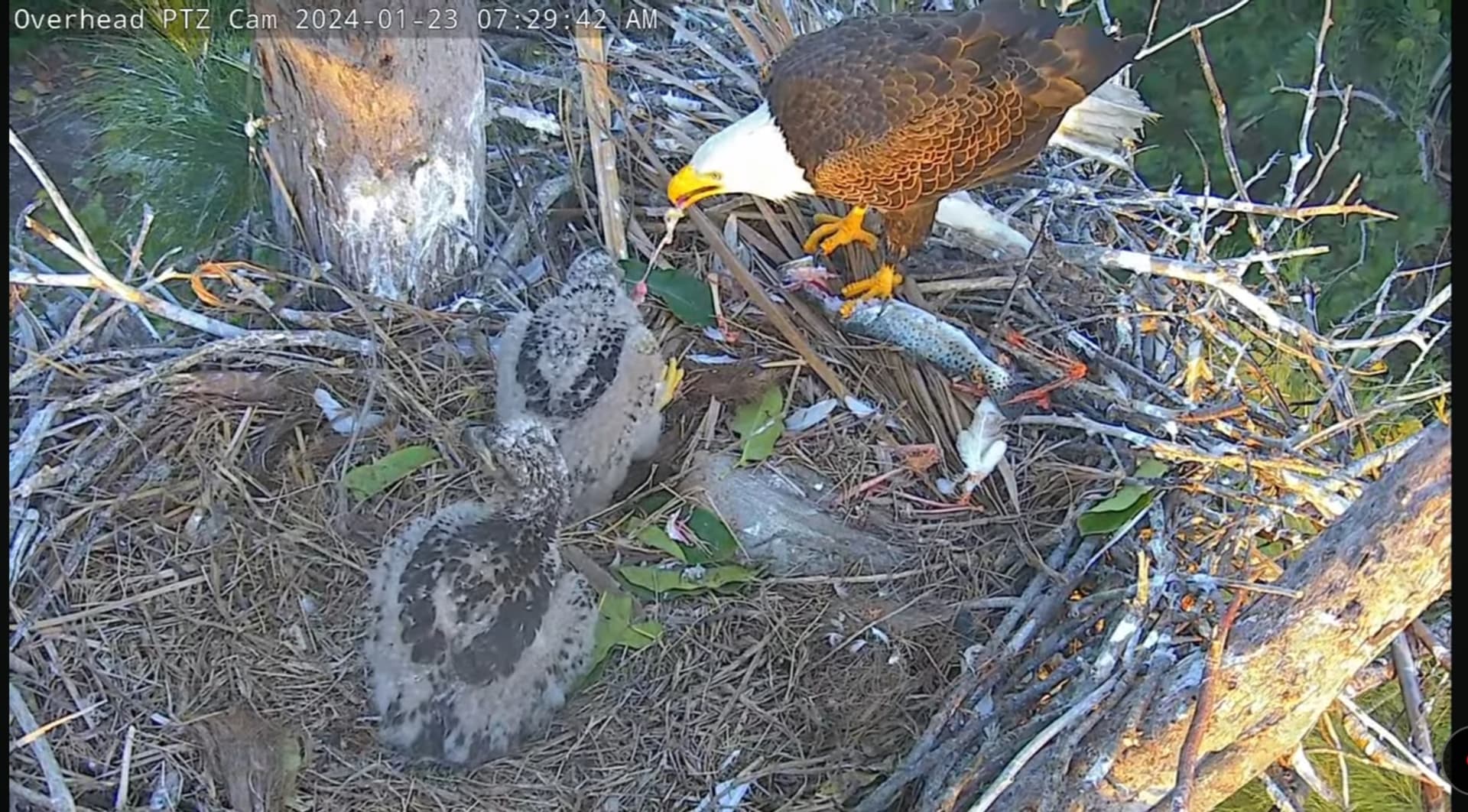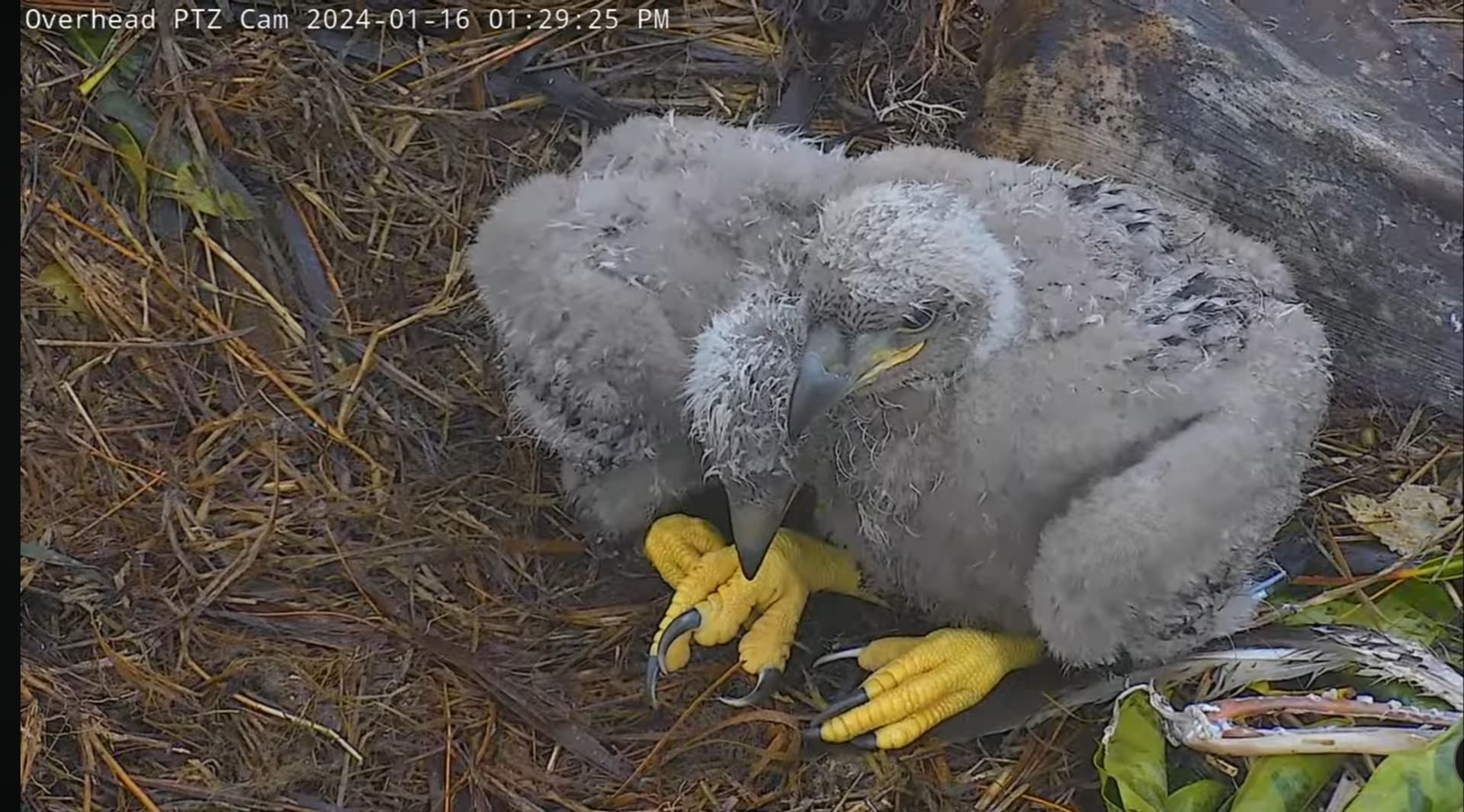 Es gibt zwei Videos von Gabby und Beau. Das Ei wurde fast 24 h nicht bebrütet und spätestens jetzt dürfte der Embryo nicht mehr lebensfähig sein. Lady Hawk schreibt, dass der Schlupf am 27.01. erfolgen würde. Während das Nest nicht besetzt war, kam ein junger und noch nicht geschlechtsreifer Adler ans Nest. Es ist unklar, ob es einer der letzten Nachkommen von Gabby ist.