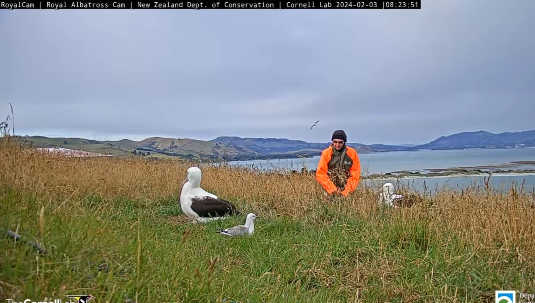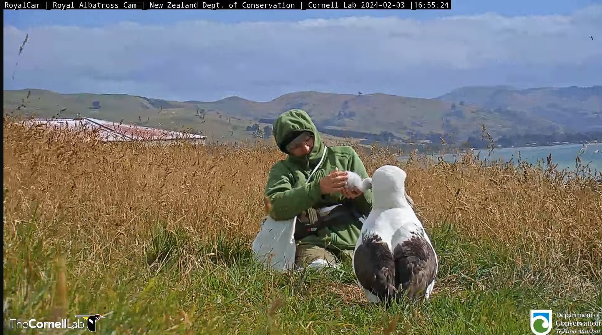 Am Morgen führt der Ranger den Check-up der beiden Küken durch, eine Möwe hat sich dazu gesellt.