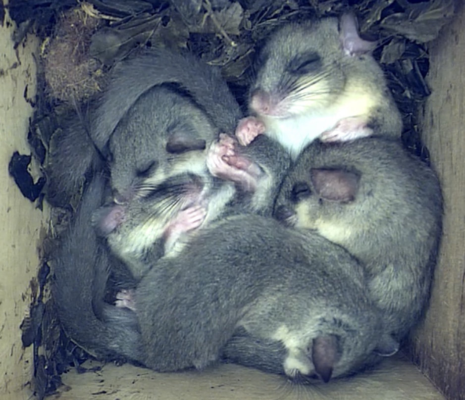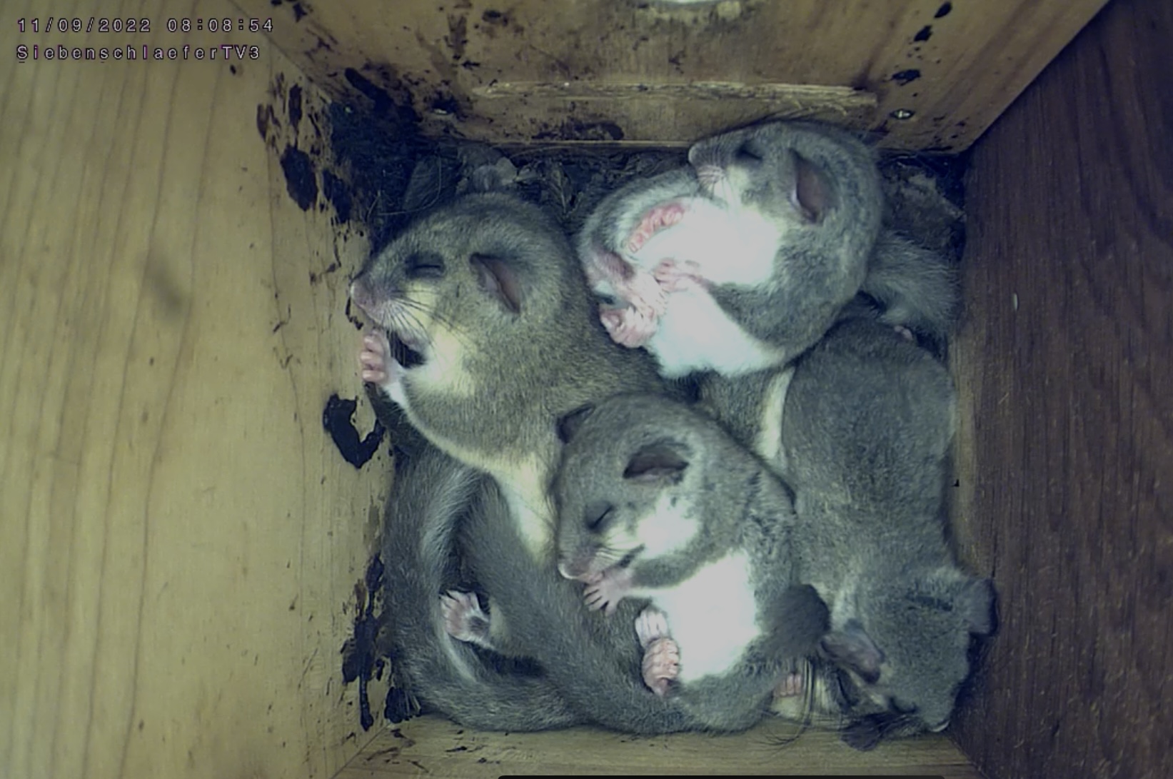 “Der Herbst naht und es wird langsam frischer. Das merken auch die Siebenschläfer und machen Gruppenkuscheln. Sie sind alle wohlgenährt, da Eichen und Buchen viele Früchte tragen. Jetzt geht es an den Aufbau des Winterspecks.“