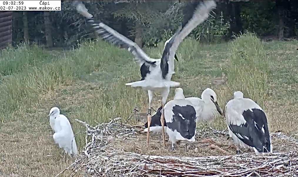 Einer der Jungstörche ist mit Flugtraining beschäftigt, den Silberreiher daneben interessiert das gar nicht.