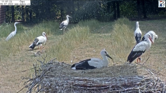 Die Jungstörche, bis auf einen, haben das Nest verlassen um den Rasen zu erkunden.