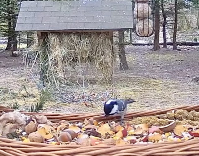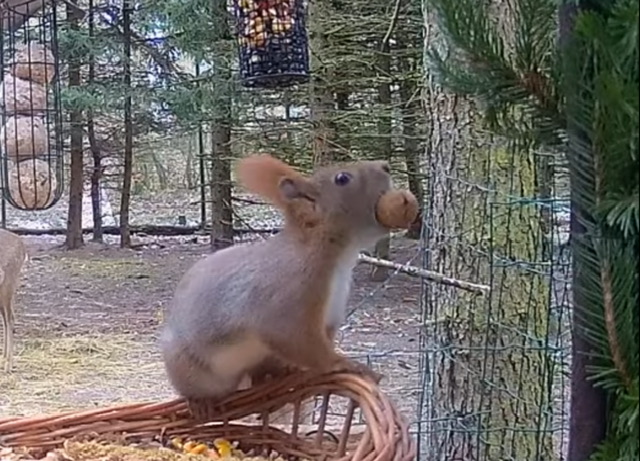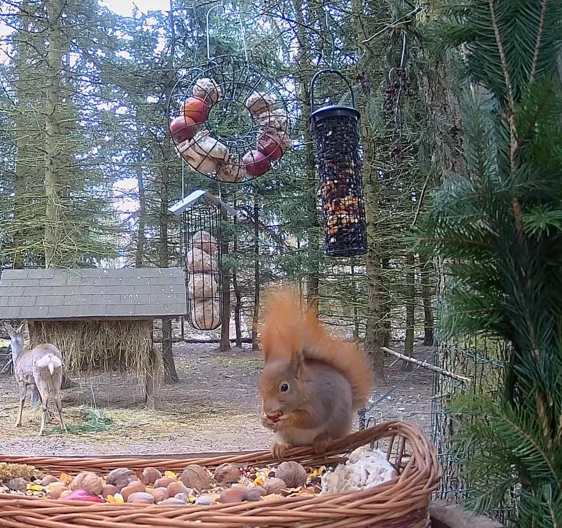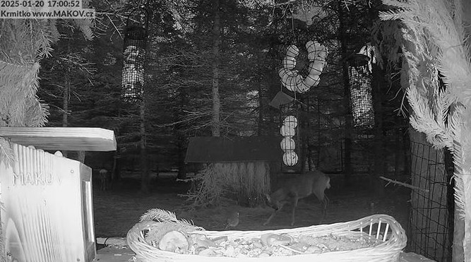 Es wird dunkel in Makov. Am Futterplatz im Wald sind alle drei Rehe und ein Rotkehlchen zu sehen. Alle entdeckt?