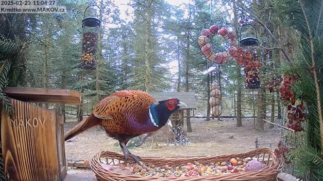 Und wieder bezaubert der schöne Fasan. Er scharrt im Futterkorb. Mufinka, die Rehe, die Schwäne und Jonáš werden es danken.