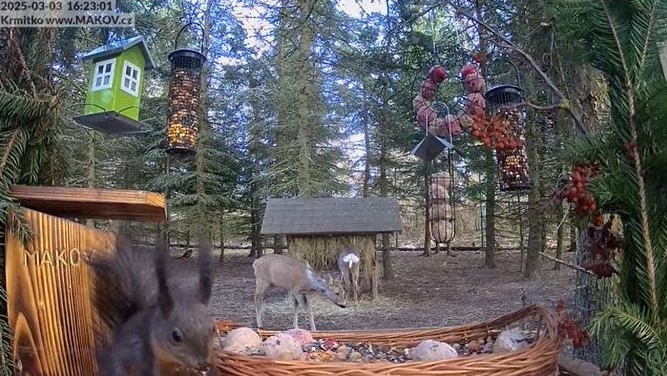 Zum Schluss tollen noch Mufinka und ein Reh herum. Man sieht, dass die Rehe wesentlich schneller sind - wenn sie wollen. So platziert sich Mufinka eher rund um die Futterraufe, um dann von dort aus loszurennen. Mufinka und das Reh spielen Fangen