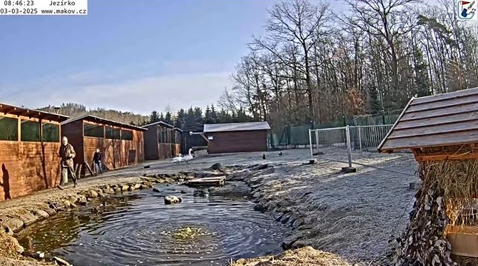 Heute früh wurde Morísek der Gänsesäger ‚das Meerschweinchen‘ am großen Teich von Herrn Libor freigelassen. Sie ist ja flugfähig und ihr gefiel es in Makov so gut, dass sie sich nicht vertreiben ließ (wer kann ihr das verübeln…). Da sie wohl den Mandarinen-Erpel mehrfach attackiert hatte, wurde sie zu den Schwarzstörchen unter das Netz gesellt. Dort lebte sie sich gut ein in dem sie ‚verhaltensoriginell‘ wurde - beste Voraussetzungen zur Integration. Nun bin ich gespannt, ob sie in Makov bleibt oder doch dem Ruf der Freiheit folgt. Wir werden sehen…