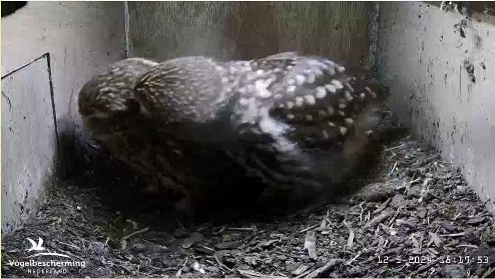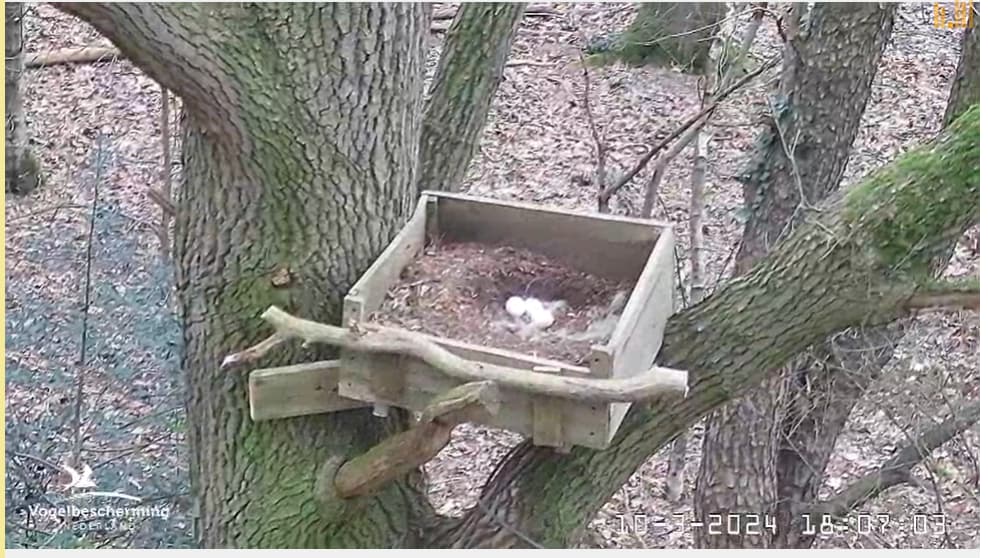 Was für ein Glück als ich grad vorbei schaute, erst das Nest mit den 3 Eiern alleine, dann kam der Papa wohl angeflogen, daraufhin dann Mutter Uhu und setzte sich sofort auf die Eier