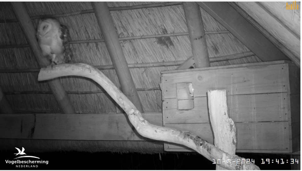 Schleiereule, eine im Kasten, die andre sitzt draußen und wartet auf Beute