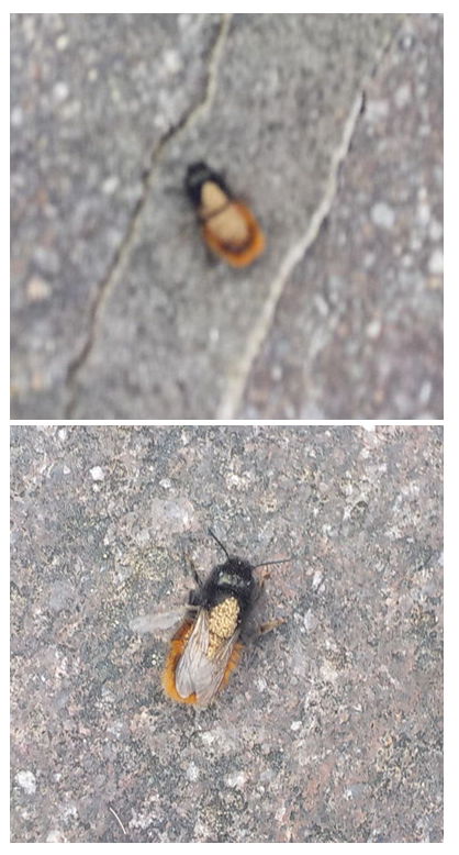 Mauerbiene stimmt, aber ich halte das für Milbenbefall liebe @IreneSpann https://www.naturgartenfreude.de/nisthilfen-wildbienen/parasiten/milben/